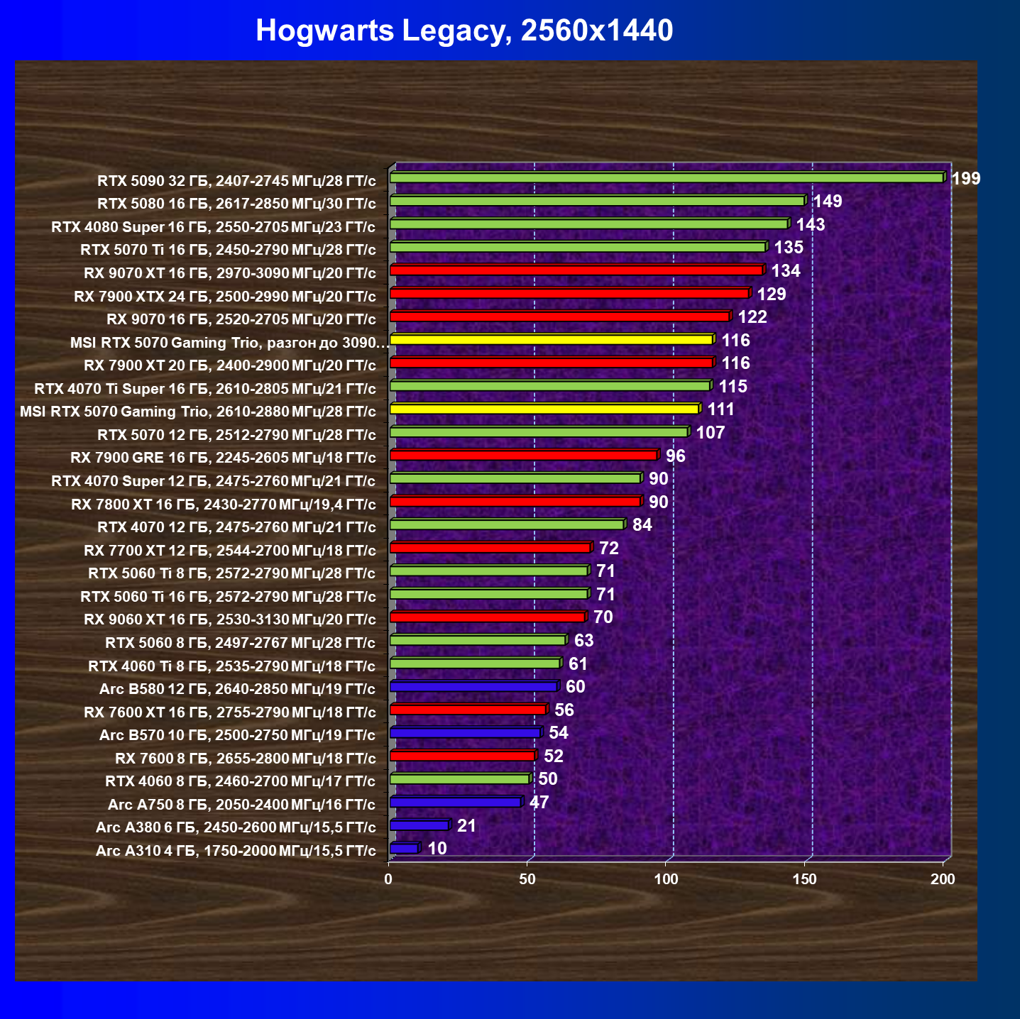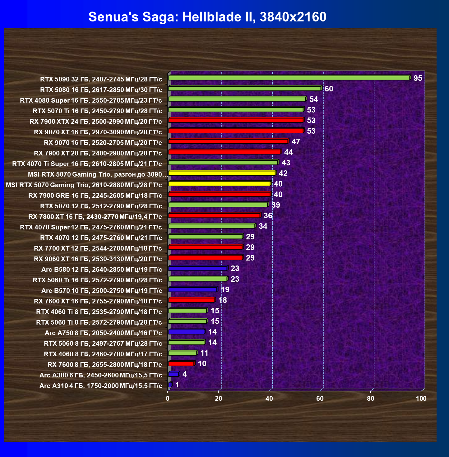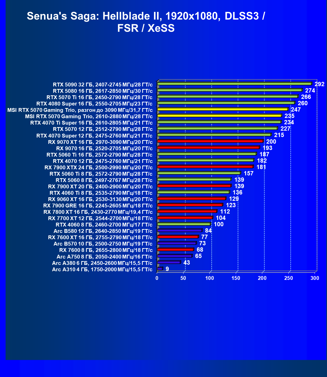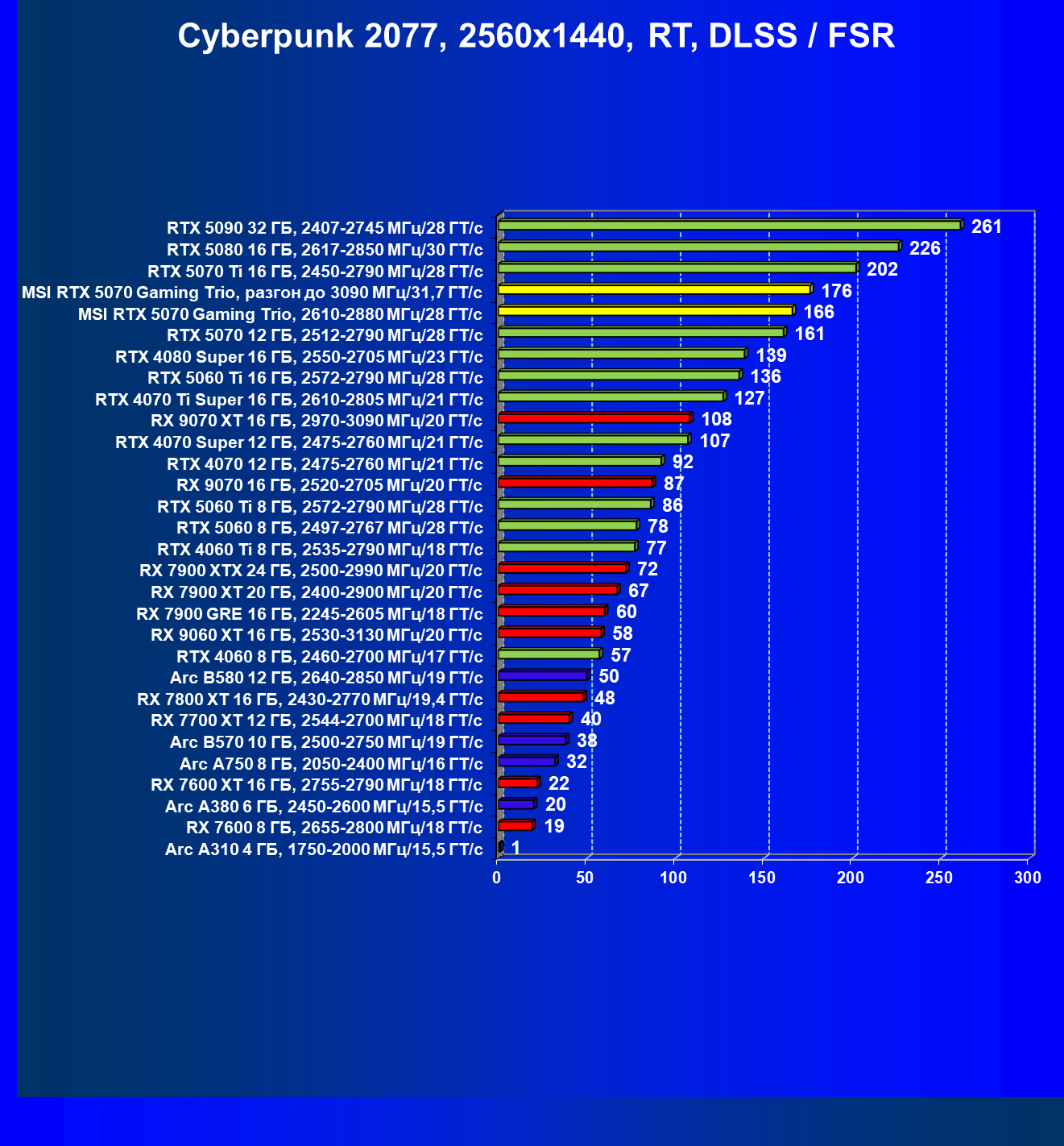 | 10 | MSI RTX 5070 Gaming Trio, 2610—2880 МГц/28 ГТ/с | 1912 | 314 | 61 000 |