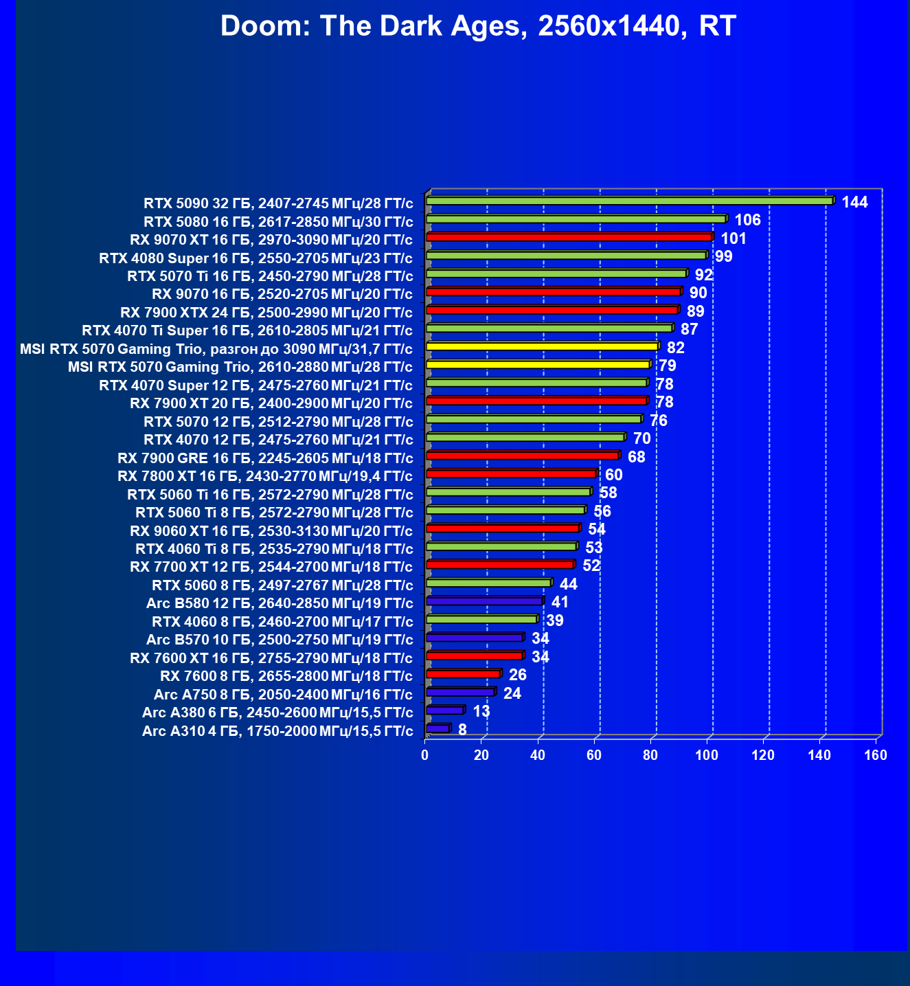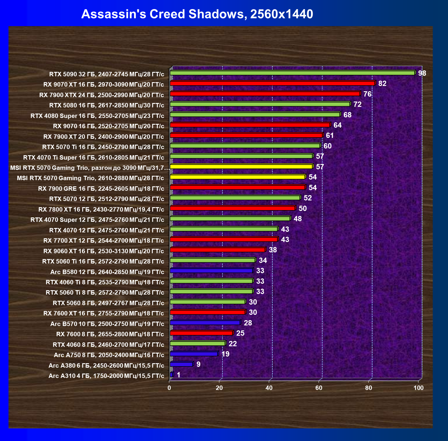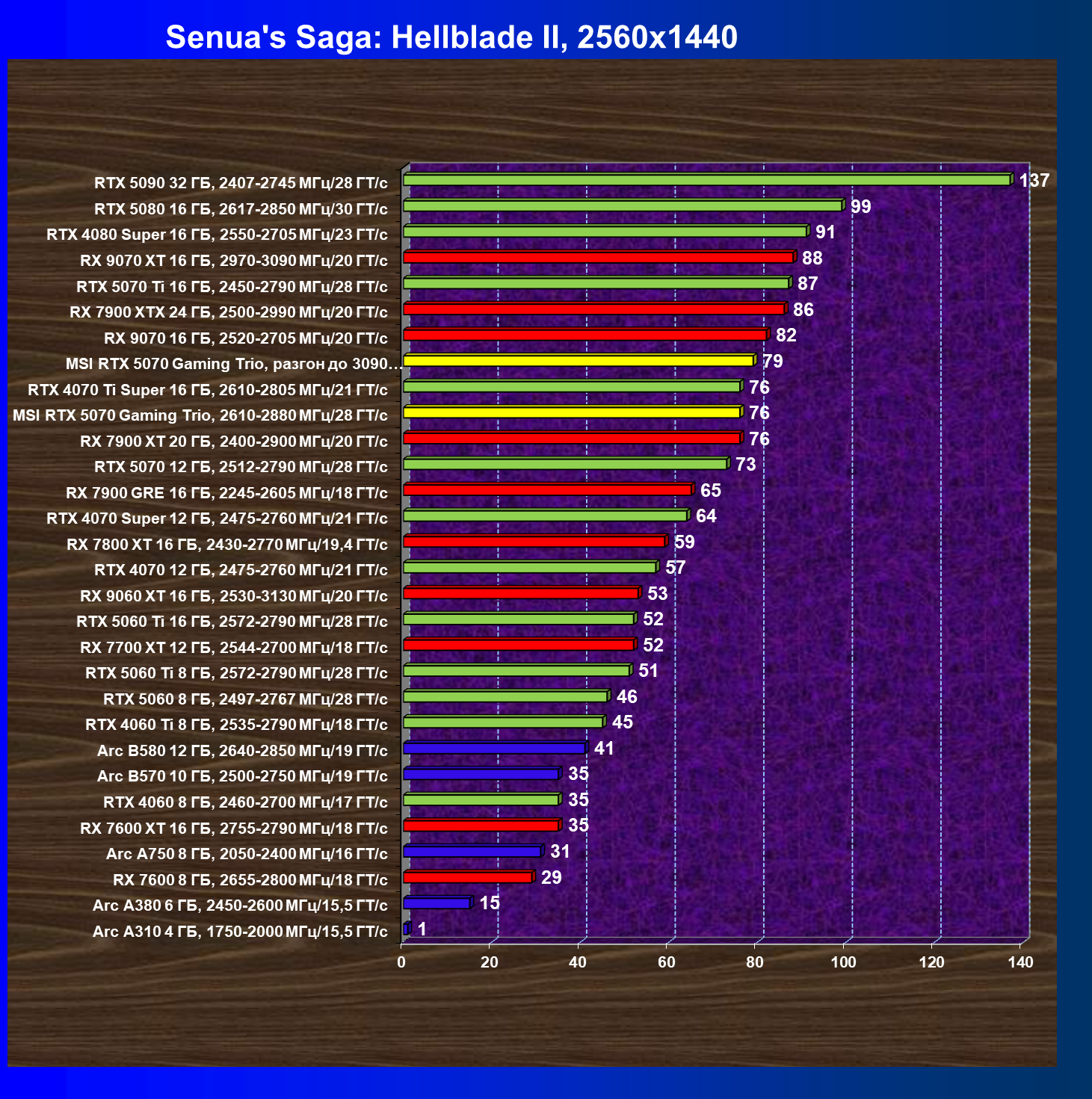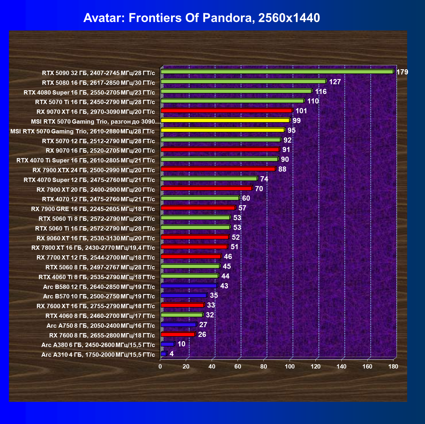 | 10 | MSI RTX 5070 Gaming Trio, 2610—2880 МГц/28 ГТ/с | 1912 | 314 | 61 000 |