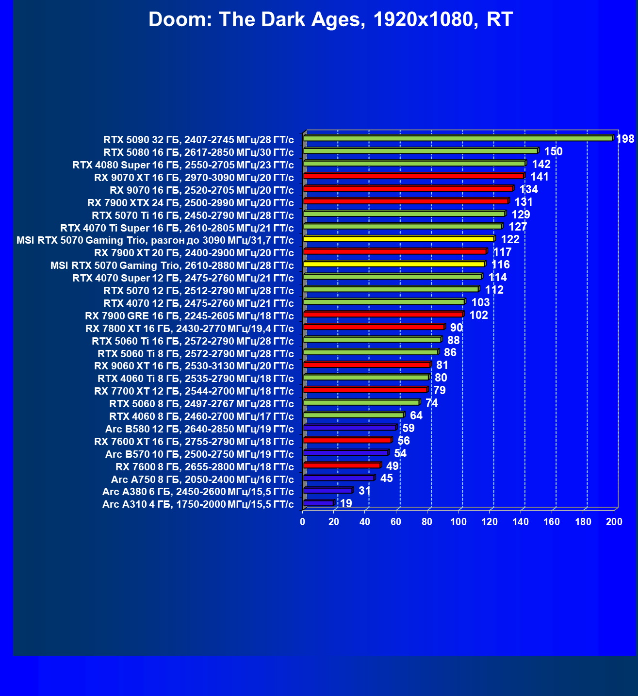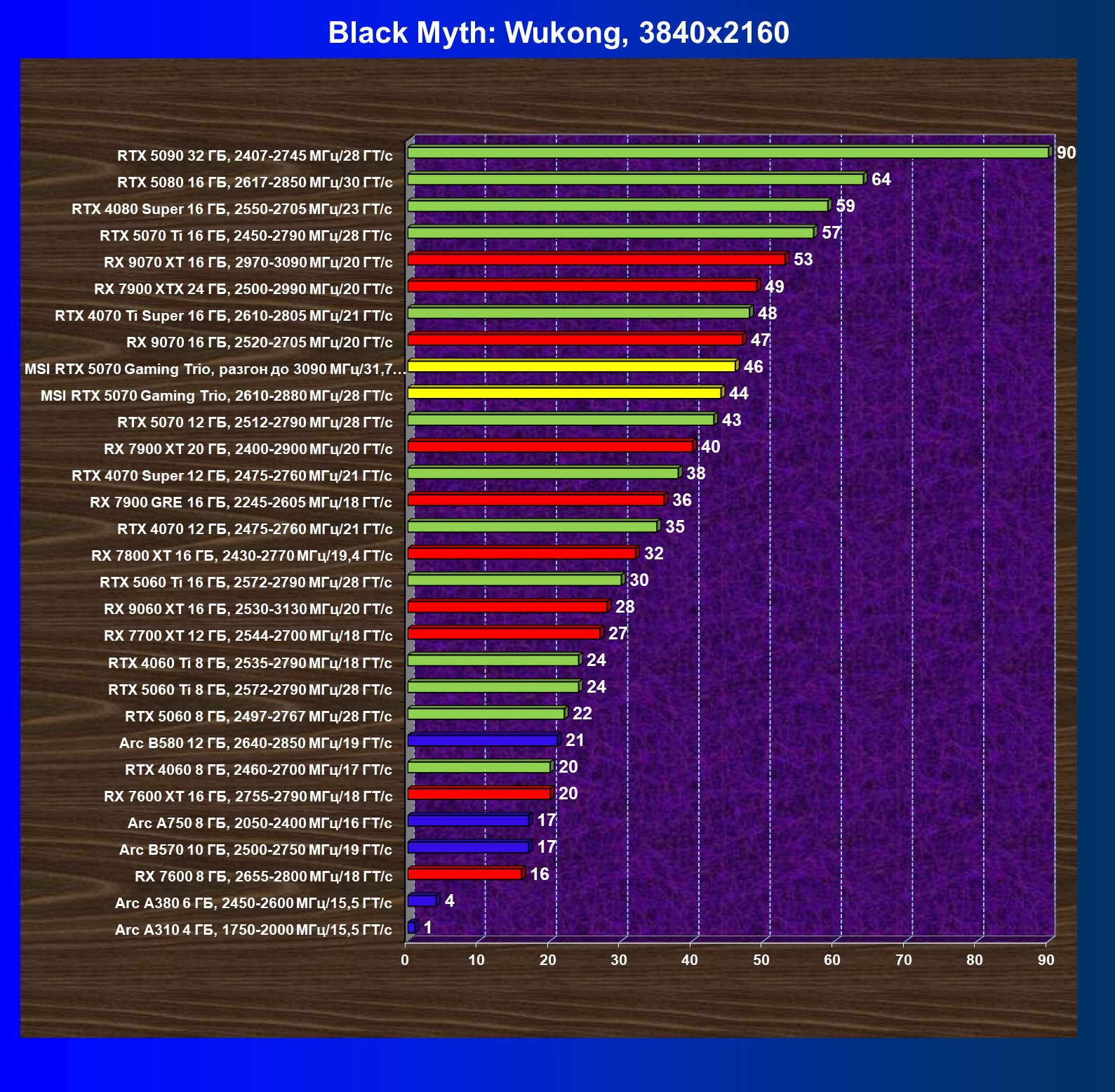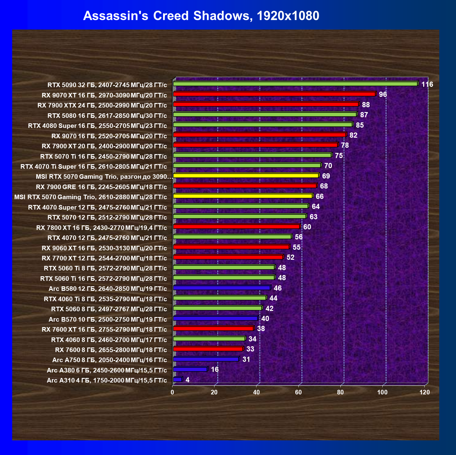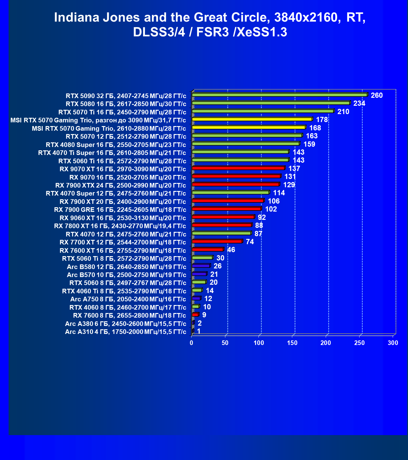 | 10 | MSI RTX 5070 Gaming Trio, 2610—2880 МГц/28 ГТ/с | 1912 | 314 | 61 000 |