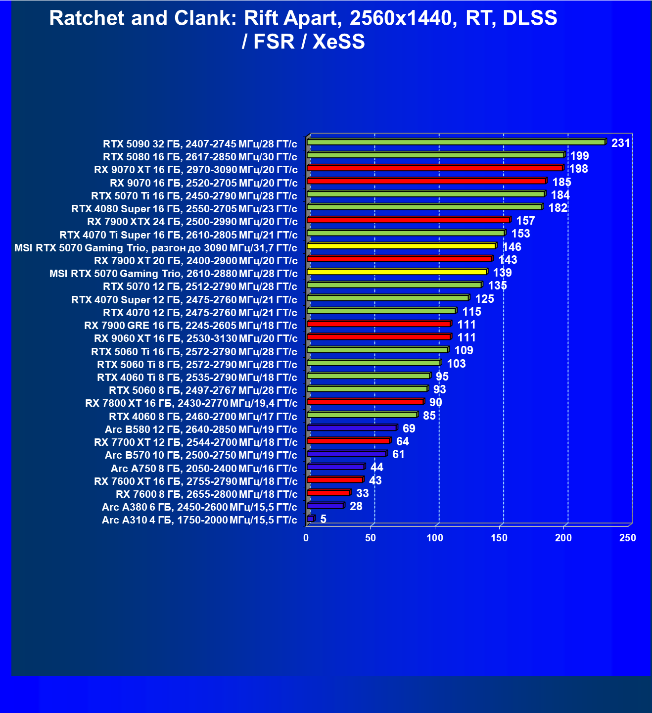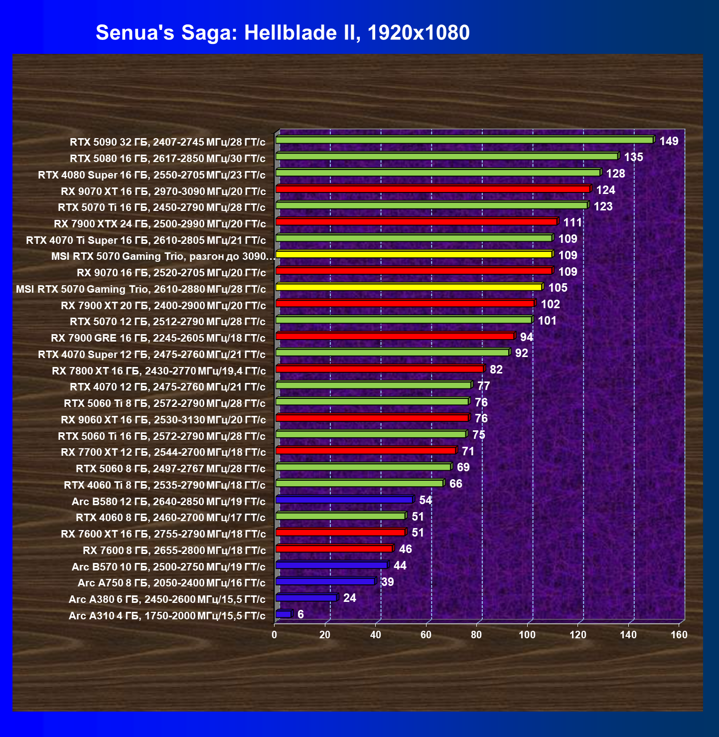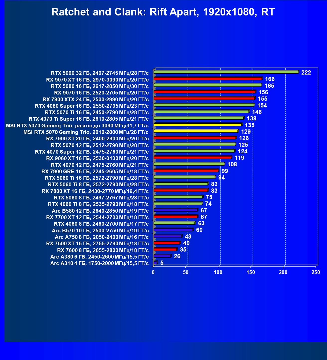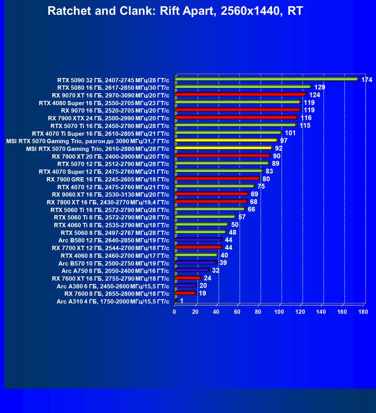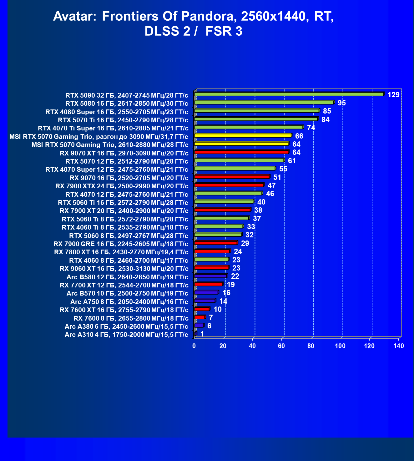 Безусловно, мощная поддержка MFG (DLSS 4) даже всего в половине игр дала сильные дивиденды, и RTX 5070 — яркий лидер не только внутри ценовой группы, но и в целом по всем 30 картам.