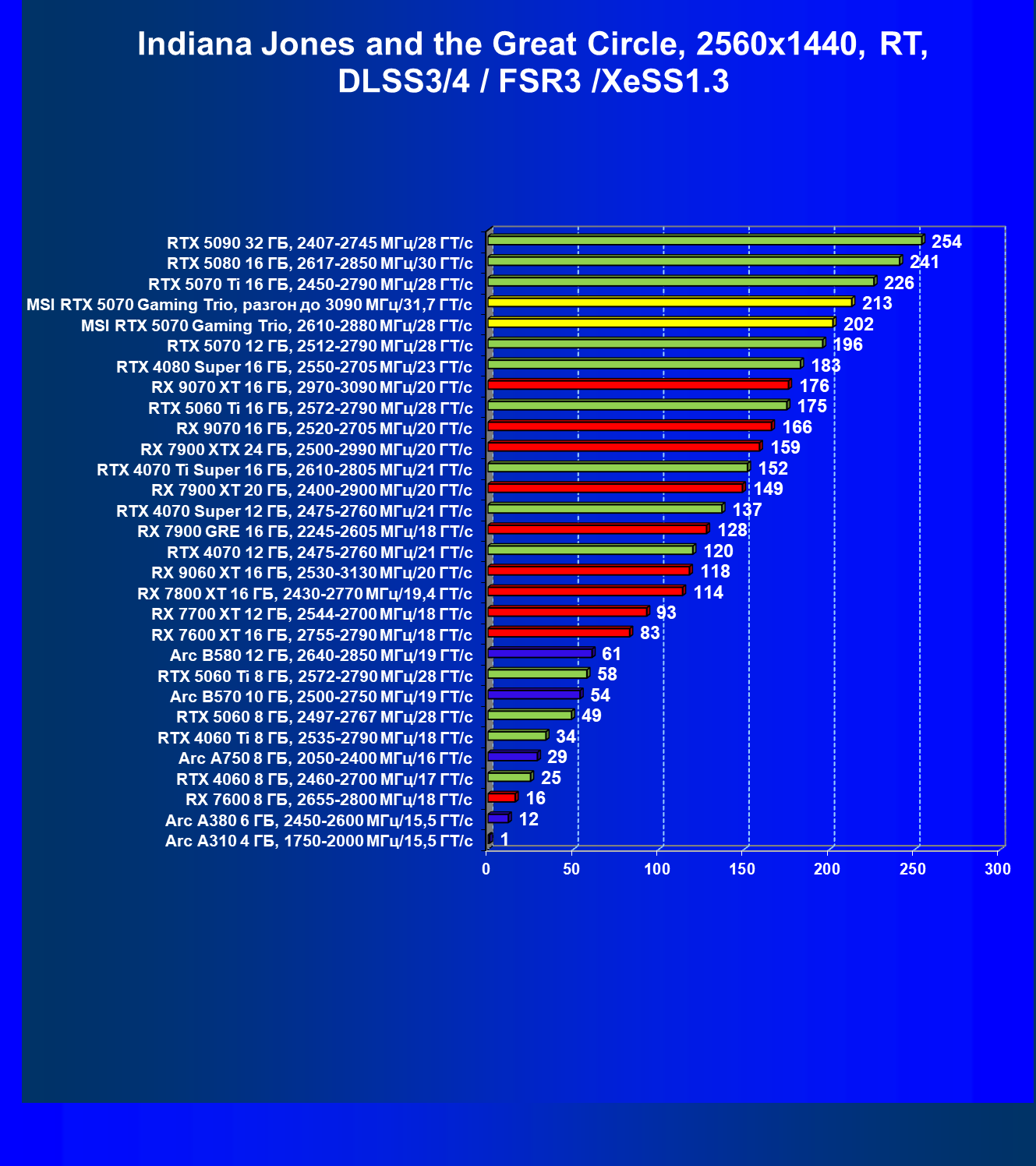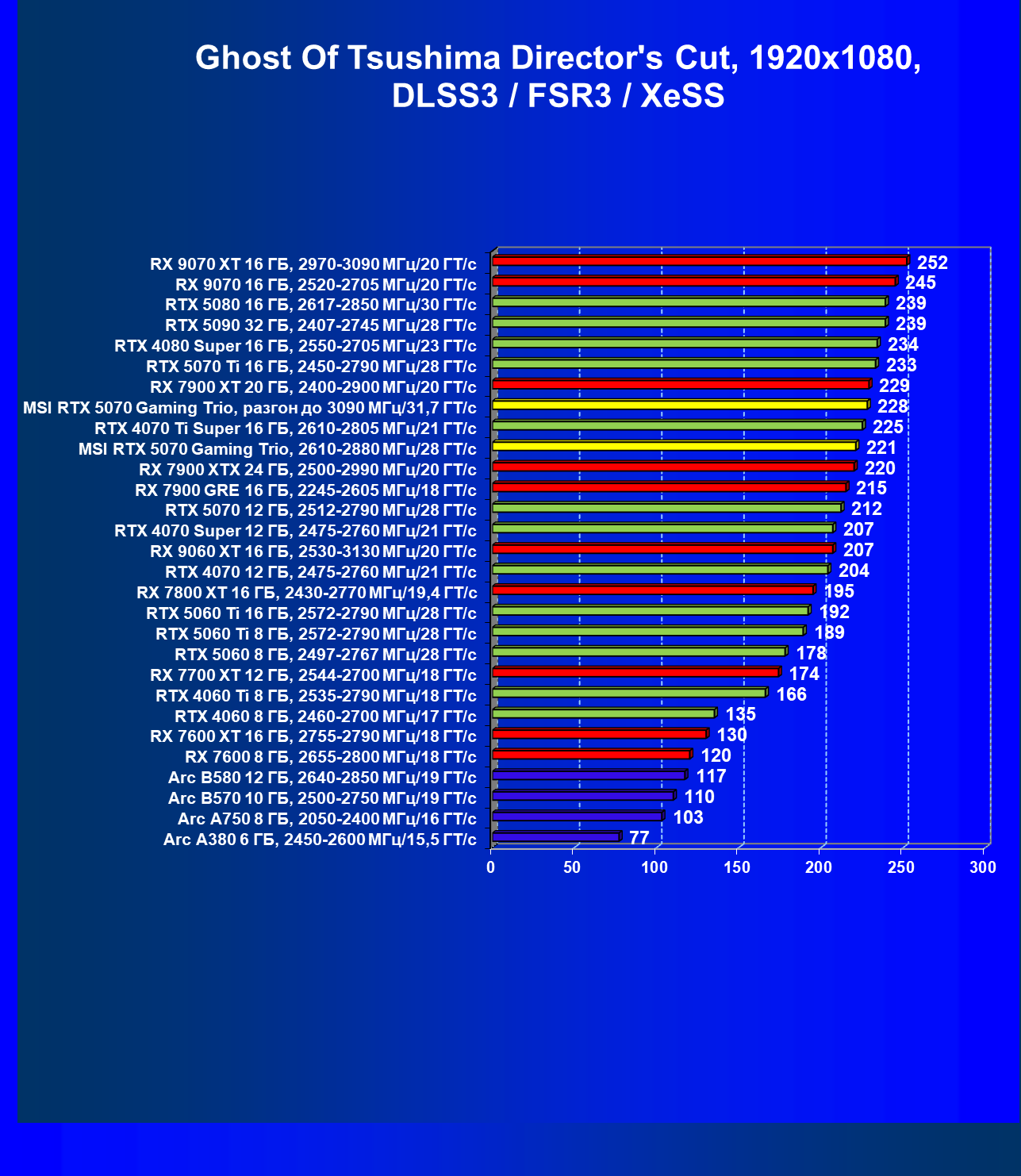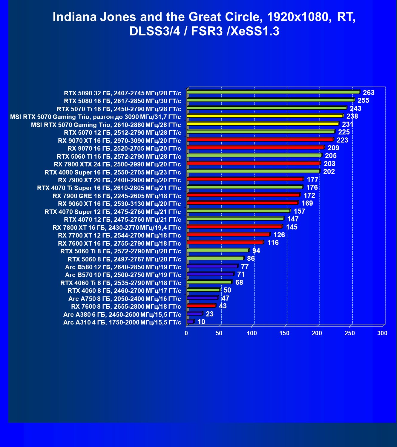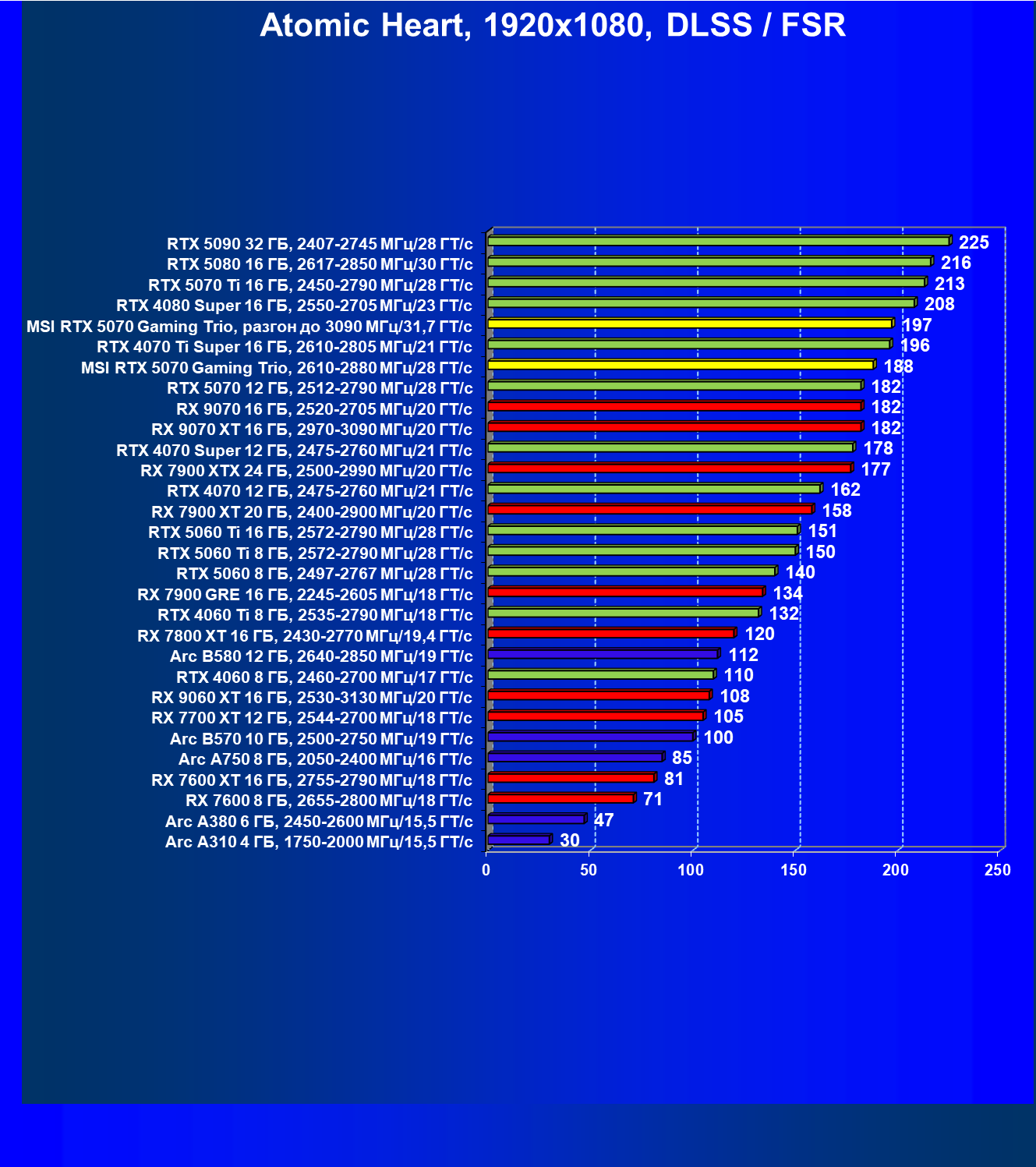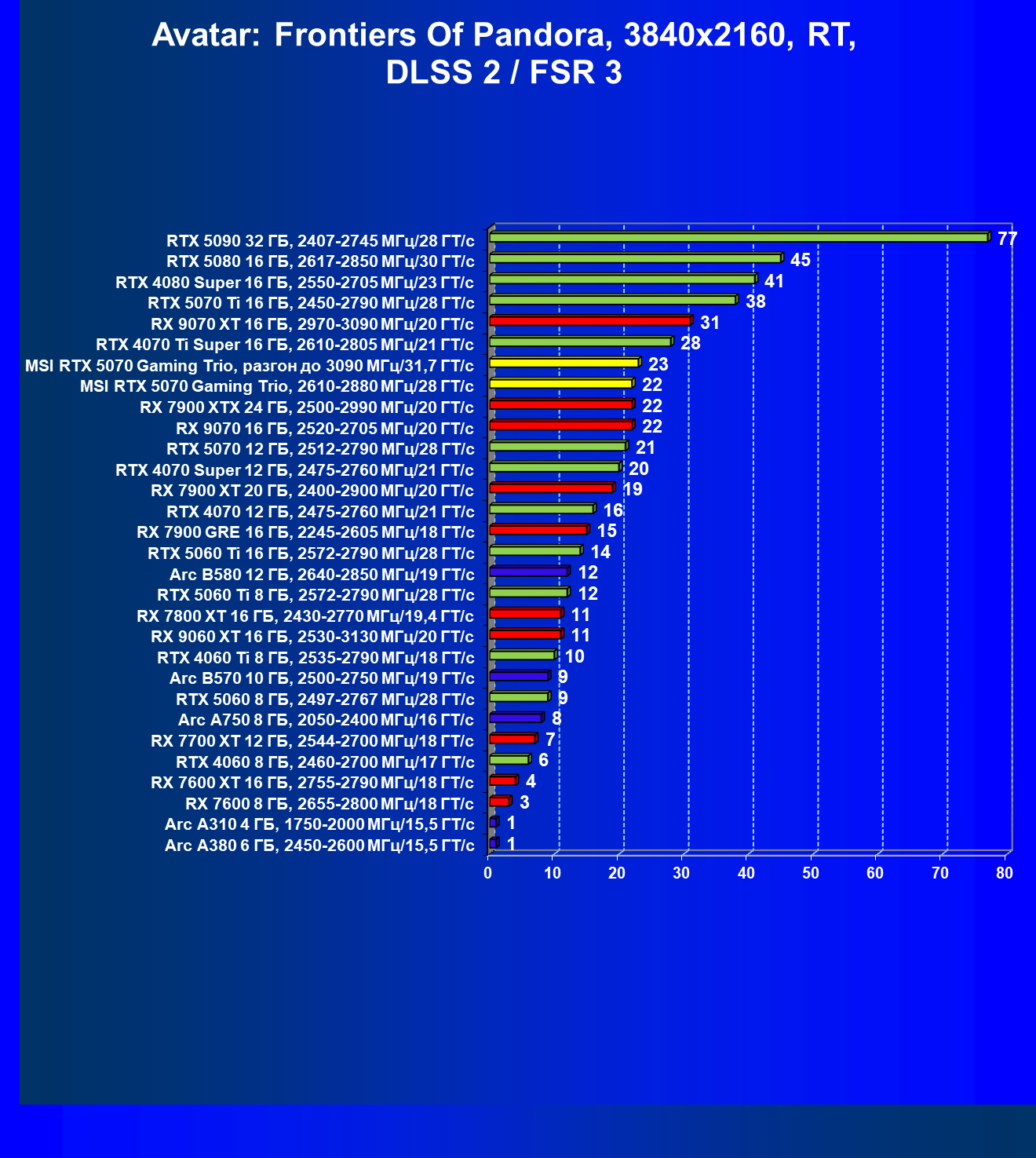 Безусловно, мощная поддержка MFG (DLSS 4) даже всего в половине игр дала сильные дивиденды, и RTX 5070 — яркий лидер не только внутри ценовой группы, но и в целом по всем 30 картам.