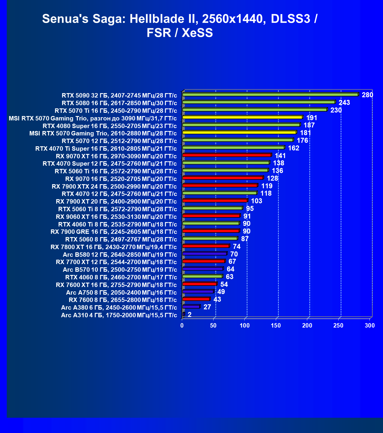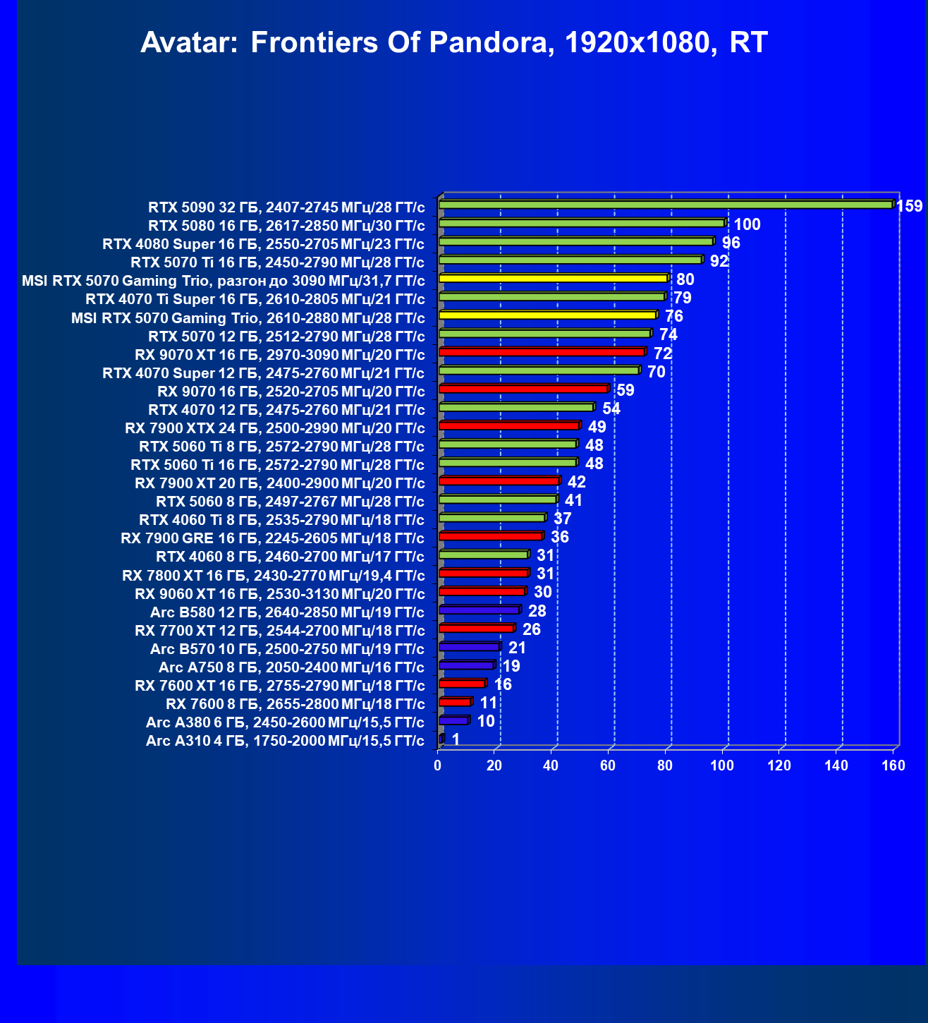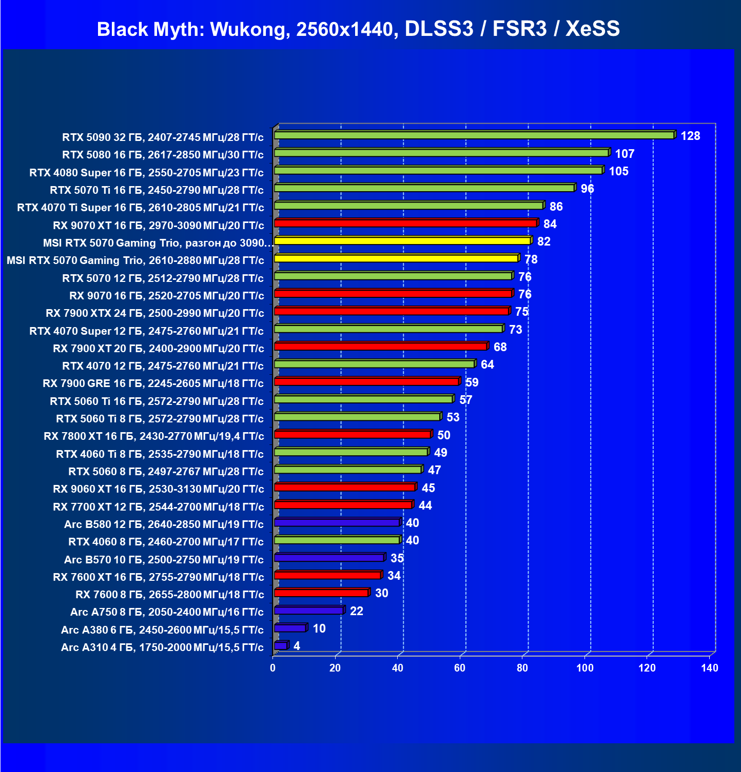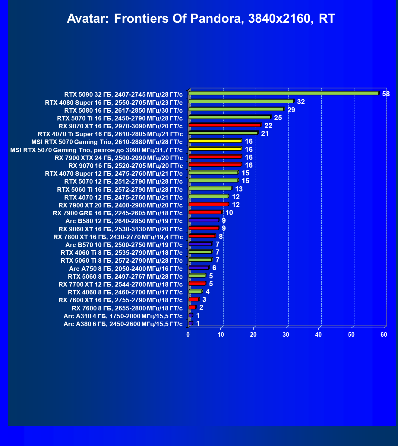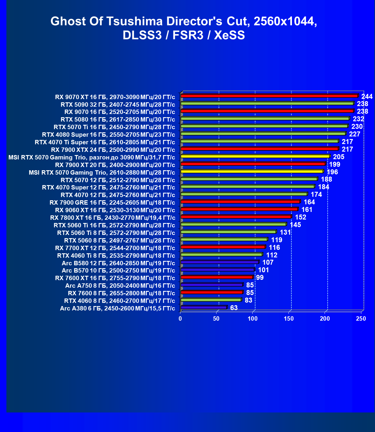 Безусловно, мощная поддержка MFG (DLSS 4) даже всего в половине игр дала сильные дивиденды, и RTX 5070 — яркий лидер не только внутри ценовой группы, но и в целом по всем 30 картам.