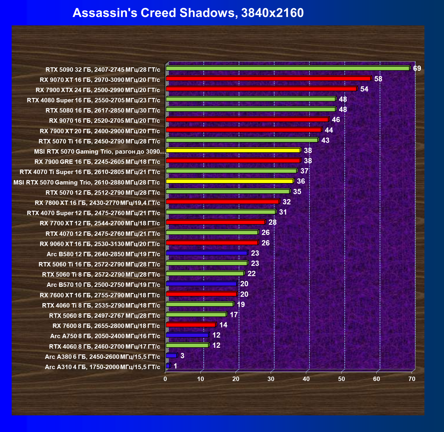 | 10 | RX 9070 16 ГБ, 2520—2705 МГц/20 ГТ/с | 4205 | 637 | 66 000 |