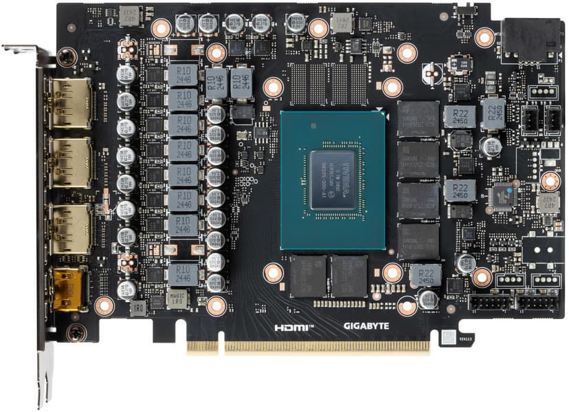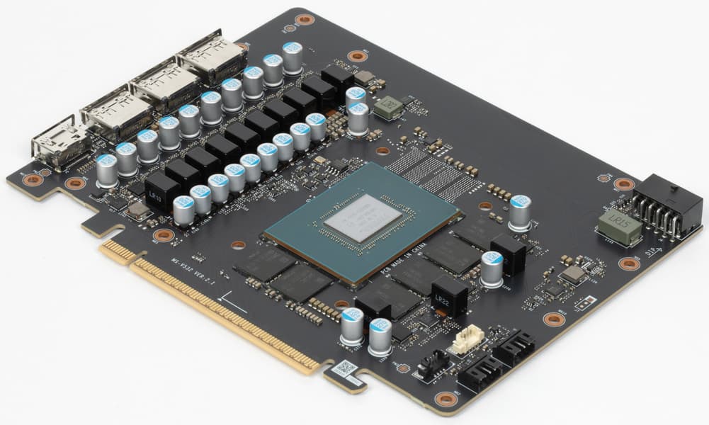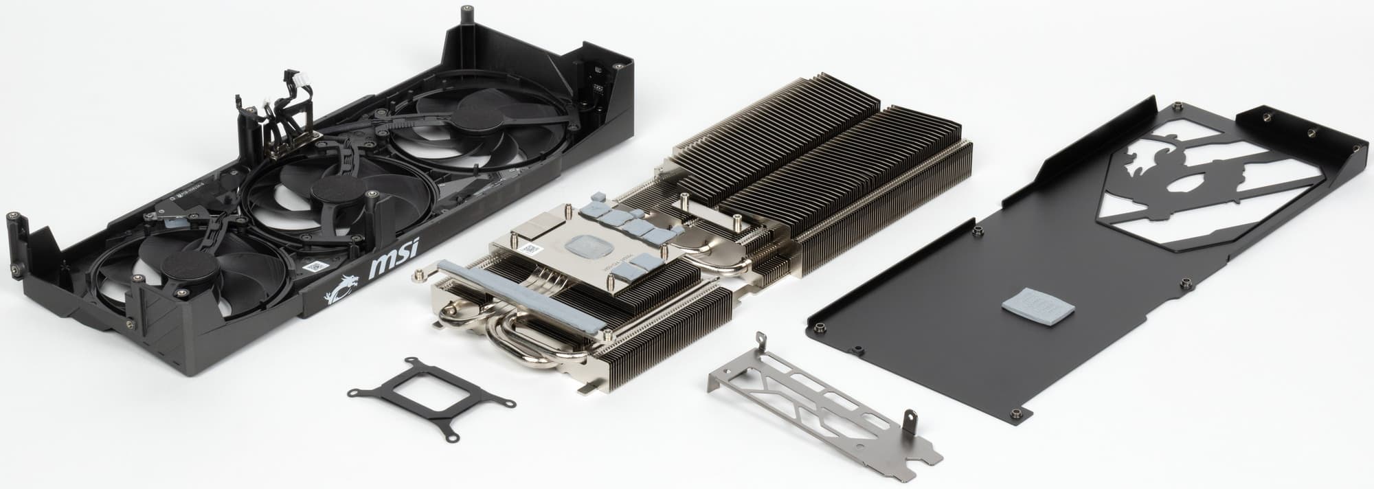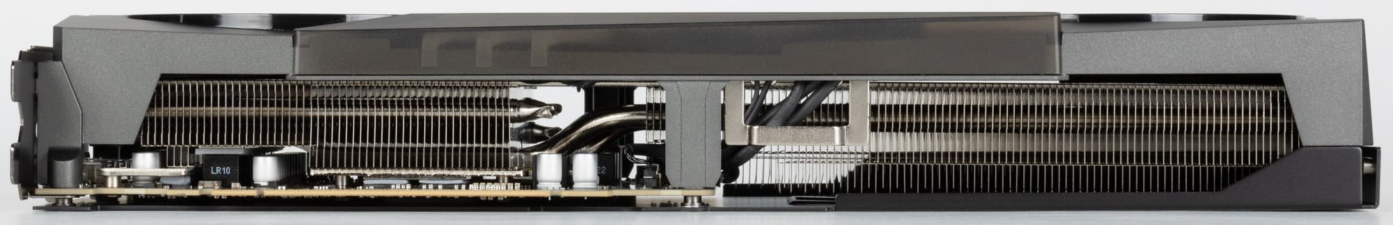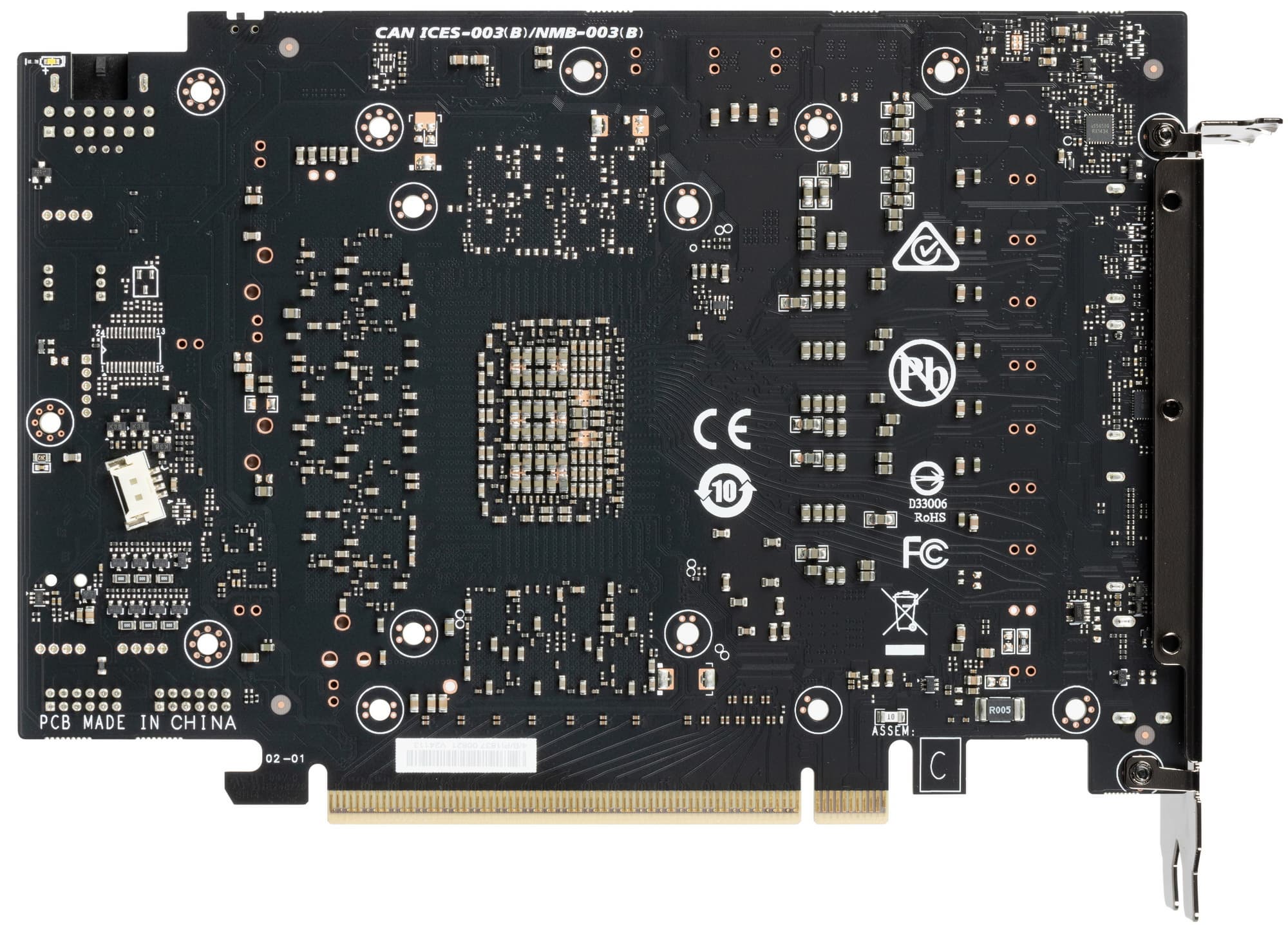 Для охлаждения преобразователей питания VRM имеются свои подошвы на радиаторе. Задняя пластина участвует в охлаждении оборотной стороны в области GPU, а также служит элементом защиты PCB.