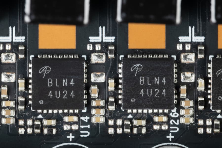 В преобразователе питания ядра и микросхем памяти используются транзисторные сборки DrMOS — AOZ5311NQI той же компании A&O, рассчитанные на 50 А.