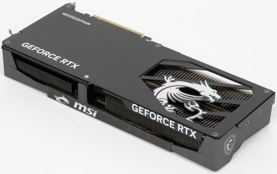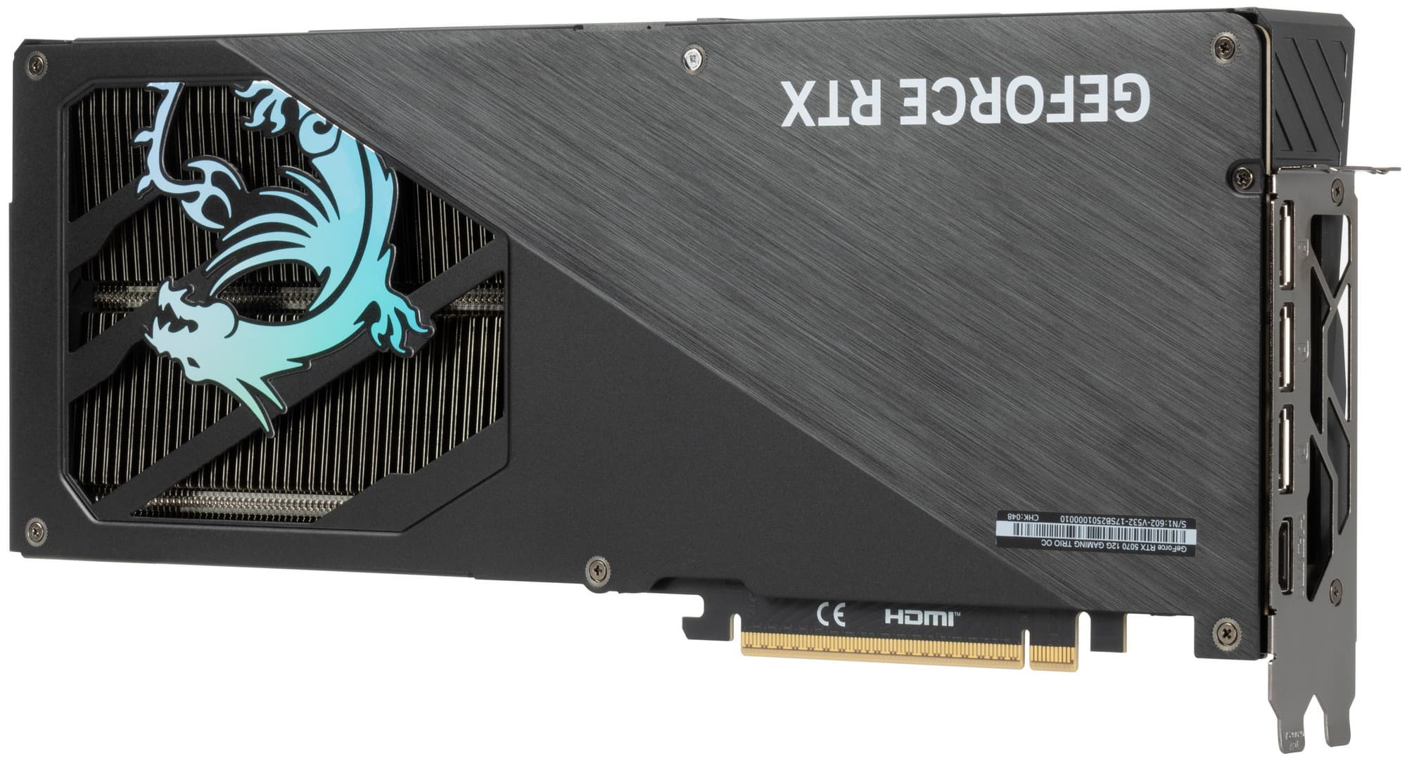MSI GeForce RTX 5070 12G Gaming Trio OC (12 ГБ) — очень сбалансированный вариант ускорителя среднего уровня. Карта MSI имеет стандартные размеры 34×14 см, занимая 3 слота в системном блоке. Использованный кулер тихий, карта может потреблять до 250 Вт (при ручном разгоне — до 280 Вт) и имеет один 16-контактный разъем питания 12VHPWR (PCIe 5.0).