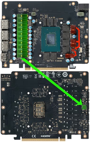 Зеленым цветом отмечена схема питания ядра, красным — памяти.