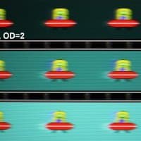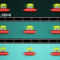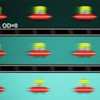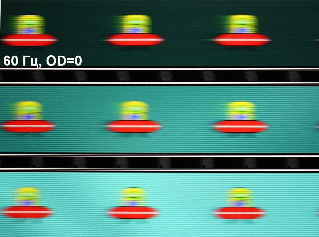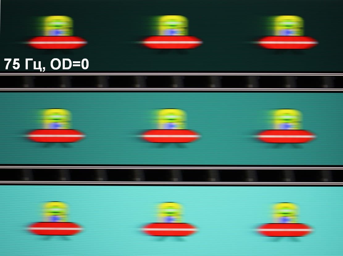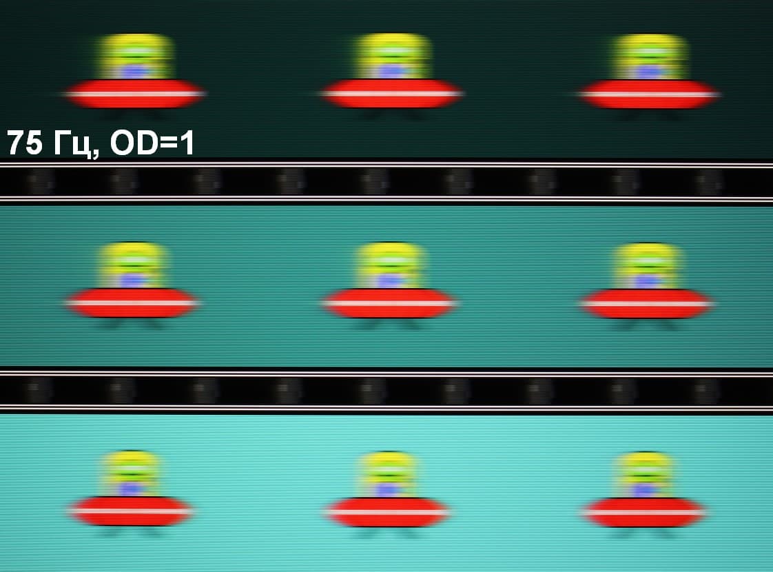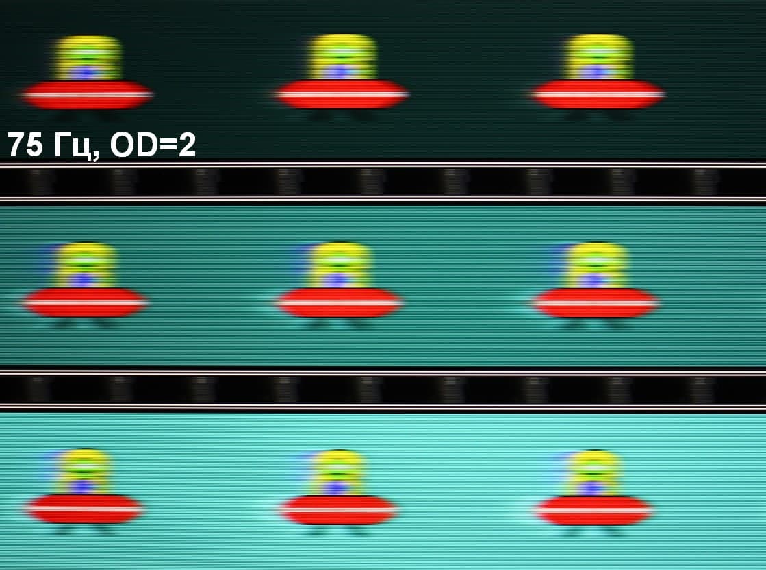 Для наглядного представления о том, что на практике означает такая скорость матрицы и какие могут быть артефакты от разгона, приведем серию снимков, полученных с помощью движущейся камеры. Такие снимки показывают, что видит человек, если он следит глазами за двигающимся на экране объектом. Описание теста приведено тут, страница с самим тестом тут. Использовались рекомендованные установки — скорость движения 960 пиксель/с для частоты 60 Гц, и 975 пиксель/с для 75 Гц. Выдержка 1/15 с, на фотографиях указаны значения частоты обновления, а также ступень разгона (OD с цифрой).