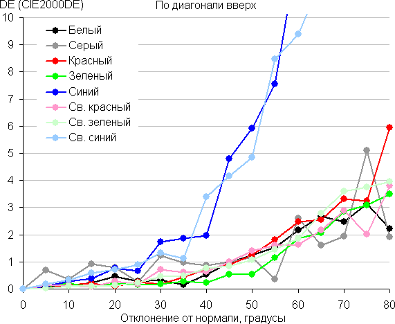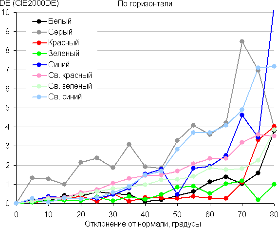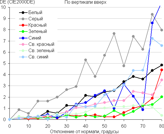 Для количественной характеристики изменения цветопередачи мы провели колориметрические измерения для белого, серого (127, 127, 127), красного, зеленого и синего, а также светло-красного, светло-зеленого и светло-синего полей во весь экран с использованием установки, подобной той, что применялась в предыдущем тесте. Измерения проводились в диапазоне углов от 0° (датчик направлен перпендикулярно к экрану) до 80° с шагом в 5°. Полученные значения интенсивностей были пересчитаны в ΔE относительно замера каждого поля при перпендикулярном положении датчика относительно экрана. Результаты представлены ниже: