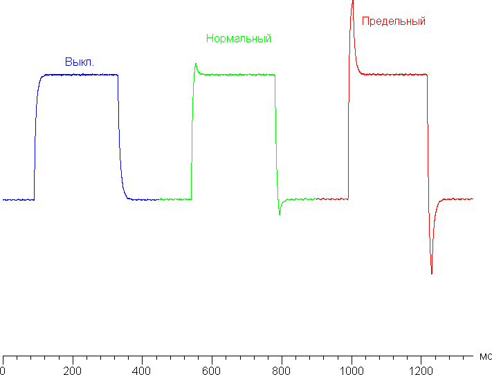 Ниже приведены графики полутонового перехода между оттенками 70% и 90% и обратно при различных значениях этой настройки (по вертикали — яркость, по горизонтали — время, для наглядности графики выстроены последовательно):