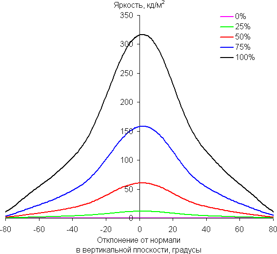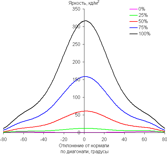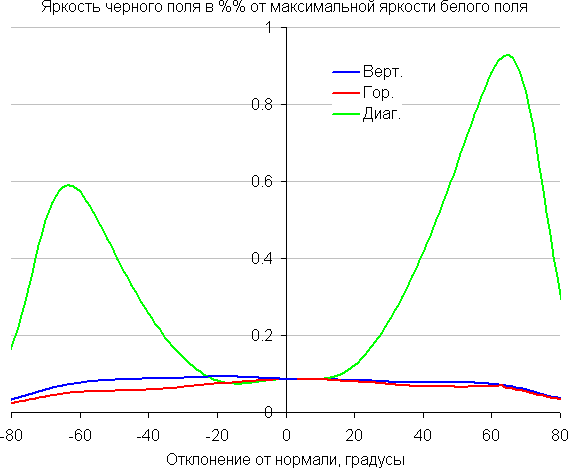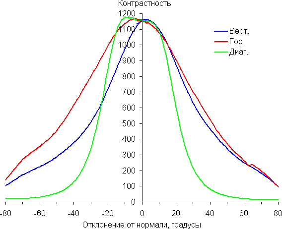 По скорости снижения яркости углы обзора не очень широкие, что для матрицы типа IPS нехарактерно. При отклонении в диагональном направлении яркость черного поля начинает резко возрастать уже при 20°-30° отклонения от перпендикуляра к экрану. Если сидеть не очень далеко от экрана, то черное поле по углам будет заметно светлее, чем в центре (приобретая слегка желтоватый оттенок). Контрастность в диапазоне углов ±82° в случае отклонения по диагонали приближается к отметке 10:1, но все же не опускается ниже.