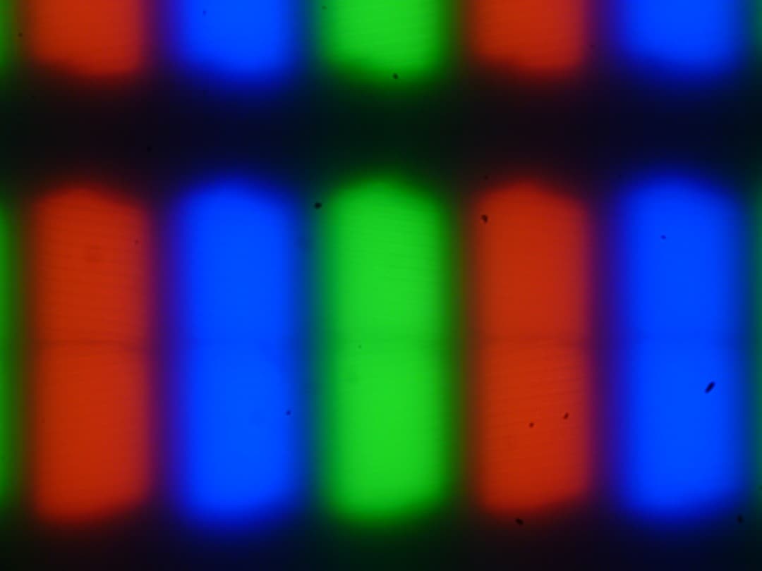 Из-за матовой поверхности экрана четкого изображения пикселей получить не удалось (черные точки — это пыль на матрице фотоаппарата), однако характерная для IPS структура субпикселей просматривается: