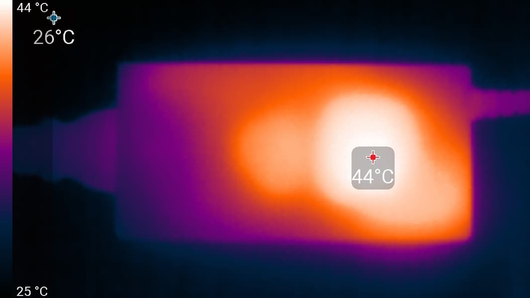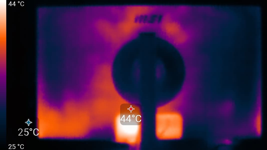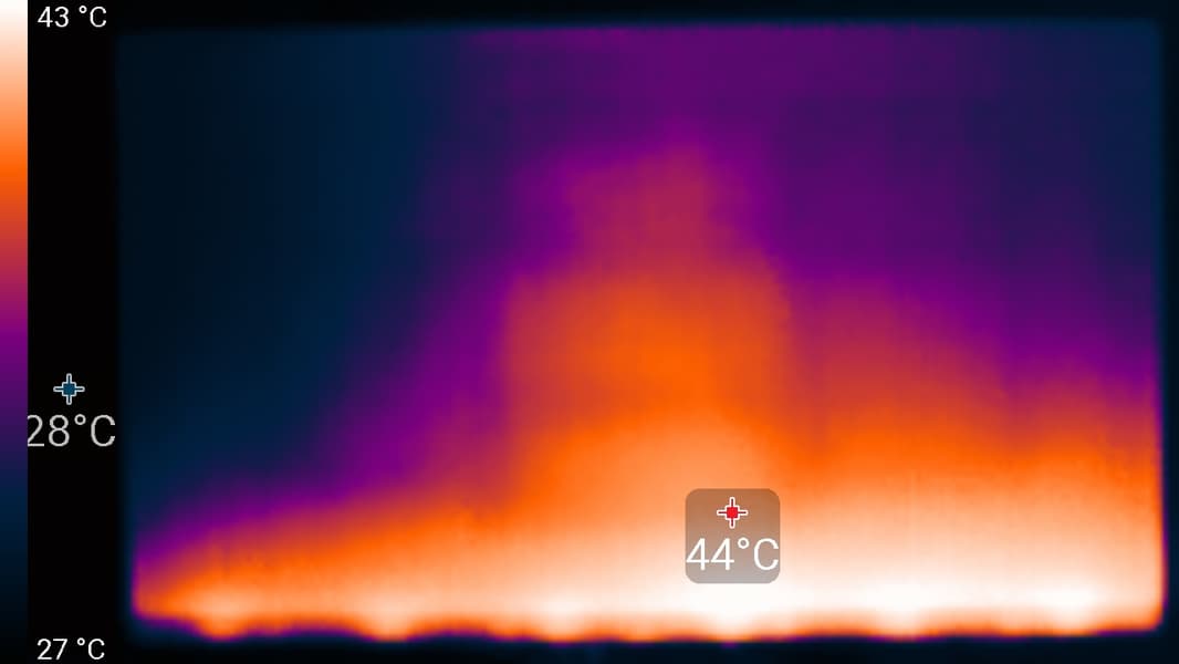 Нижний край экрана нагрелся до 44 °C максимум. Видимо, внизу находится светодиодная линейка подсветки экрана. Нагрев сзади умеренный: