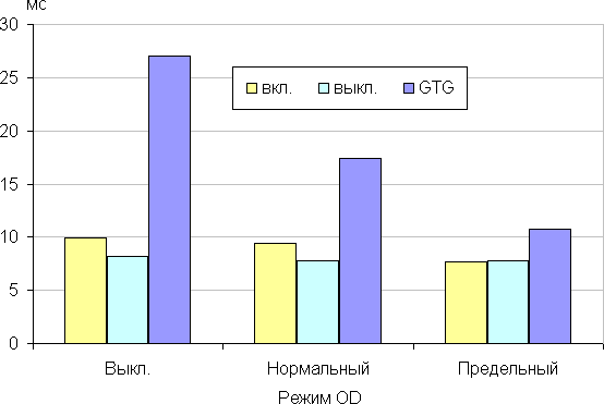 Время отклика зависит от значения настройки Режим OD, которая управляет разгоном матрицы. Ступени регулировки три. Диаграмма ниже показывает, как меняется время включения и выключения при переходе черный-белый-черный (столбики «вкл.» и «выкл.»), а также среднее суммарное время для переходов между полутонами (столбики GTG):
