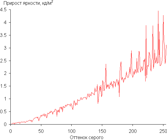 Реальная гамма-кривая ближе всего к стандартной при Гамма 1, поэтому далее мы измерили яркость 256 оттенков серого (от 0, 0, 0 до 255, 255, 255) при этом значении. График ниже показывает прирост (не абсолютное значение!) яркости между соседними полутонами: