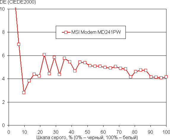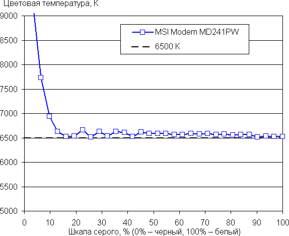 Цветовой баланс просто при выборе профиля Пользователь без дополнительной коррекции (при этом достигаются максимальные значения яркости и контрастности) хороший, так как цветовая температура близка к стандартным 6500 К, и отклонение от спектра абсолютно черного тела (параметр ΔE) меньше 10 единиц, что для потребительского устройства считается хорошим показателем. При этом оба параметра мало изменяются на различных участках шкалы серого, что улучшает визуальное восприятие цветового баланса.