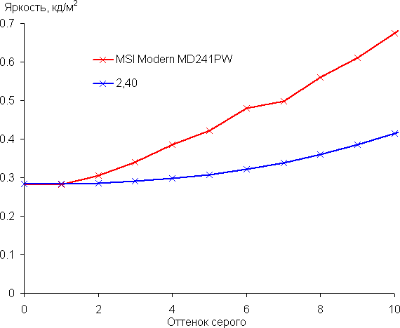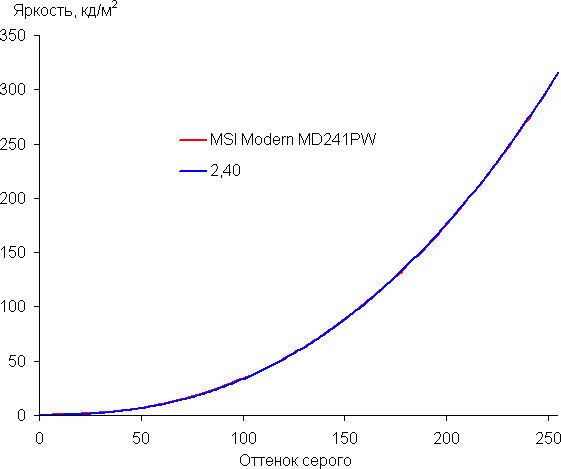 Аппроксимация полученной гамма-кривой дала показатель 2,40, что выше стандартного значения 2,2, поэтому картинка чуть затемнена. При этом реальная гамма-кривая мало отклоняется от аппроксимирующей степенной функции: