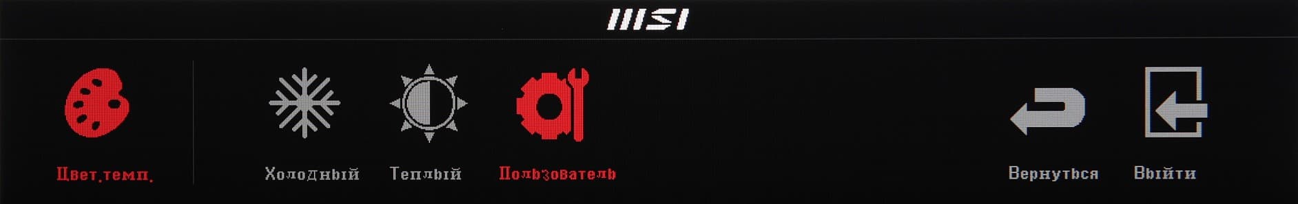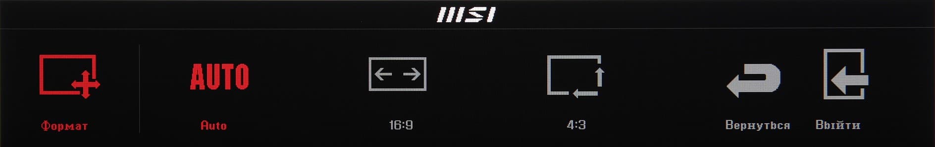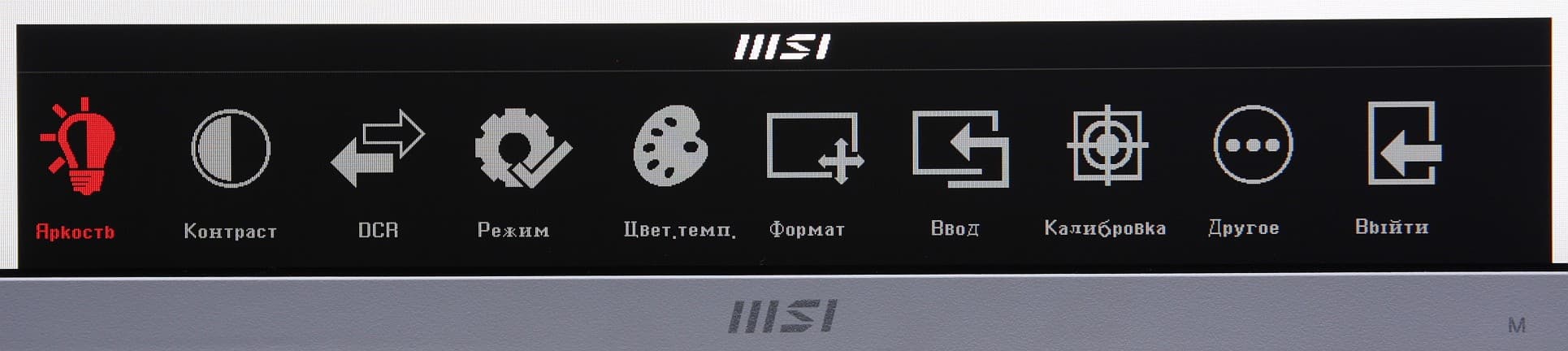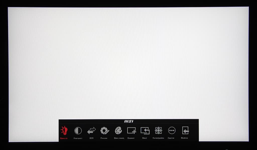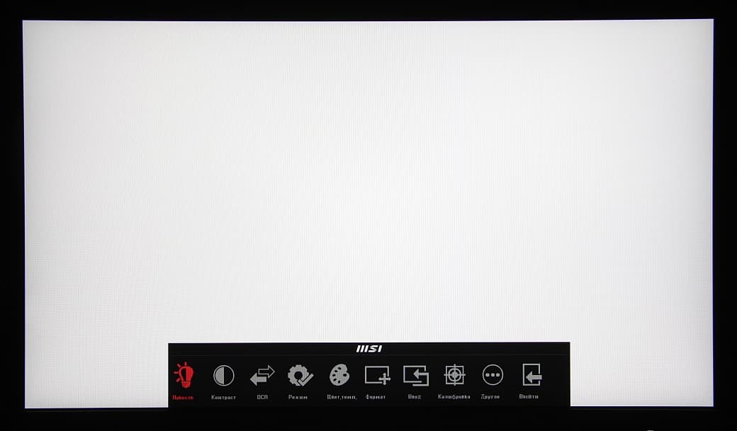 Индикатор питания при работе светится белым, в режиме ожидания — оранжевым и не горит, если монитор условно (механического выключателя питания, к сожалению, нет) выключен. Когда на экране нет меню, то при первом нажатии на первую (если слева направо) кнопку выводится главное меню с настройками, на вторую — перекрестие прицела в центре экрана (и последующие нажатия на эту кнопку меняют вид перекрестия), на третью — перебираются профили изображения, на четвертую — выводится меню выбора входа. Главное меню достаточно крупное, надписи читаемые. Оно представляет собой горизонтальную ленту с подписанными значками, расположенную в нижней части экрана (для масштаба: белое поле — это вся область отображения):