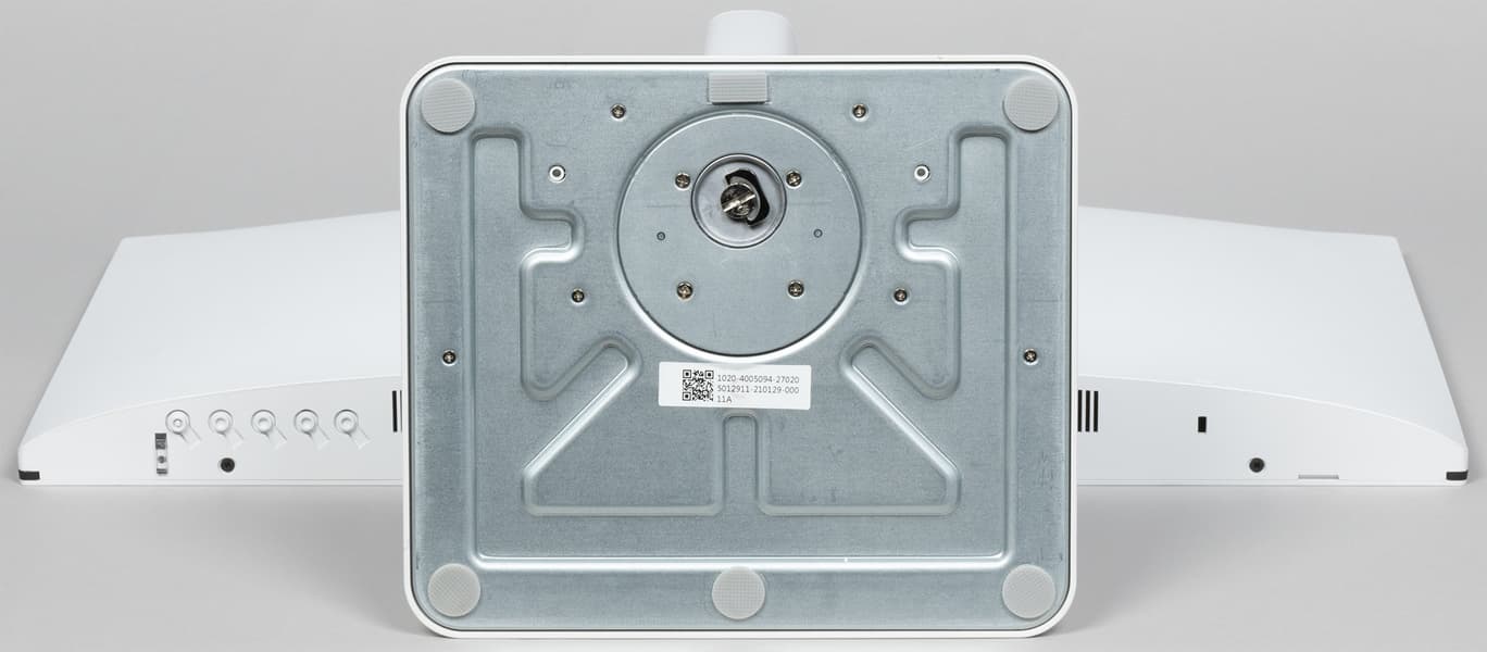 Чтобы выдержать вес монитора, ряд ответственных деталей подставки изготовлены из алюминиевого сплава (стойка) и толстой штампованной стали. Конструкция подставки достаточно жесткая, она обеспечивает монитору хорошую устойчивость. Резиновые накладки снизу на основании подставки защищают поверхность стола от царапин и предотвращают скольжение монитора на гладких поверхностях.