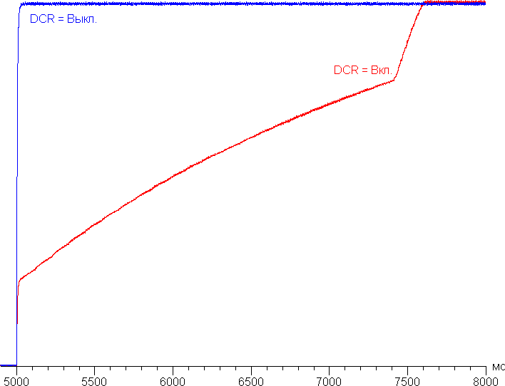 При включении режима DCR с динамическим управлением яркости установившаяся контрастность формально возрастает, но не до бесконечности, так как даже на черном поле во весь экран подсветка совсем не выключается. График ниже показывает, как увеличивается яркость (вертикальная ось) при переключении с черного поля во весь экран (после 5 секунд выдержки) на белое поле во весь экран при выключенной и включенной динамической подстройки яркости: