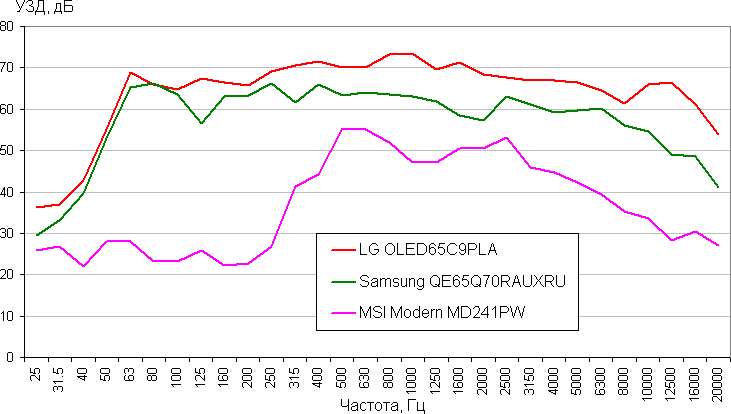 Сравним АЧХ акустики этого монитора с АЧХ двух телевизоров высшего класса (получена с помощью шумомера при воспроизведении звукового файла с розовым шумом, интервал УЗД в 1/3 октавах):