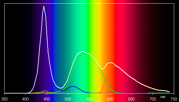 Впрочем, отклонения координат первичных цветов от вершин sRGB не очень большие, поэтому визуально цвета на этом мониторе имеют естественную насыщенность. Ниже приведен спектр для белого поля (белая линия), наложенный на спектры красного, зеленого и синего полей (линии соответствующих цветов):