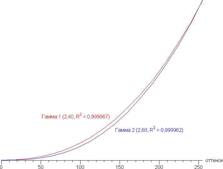 Реальная гамма-кривая зависит от выбранного профиля в списке Гамма (значения показателя аппроксимирующей функции приведены в скобках в подписях, там же — коэффициент детерминации R²):