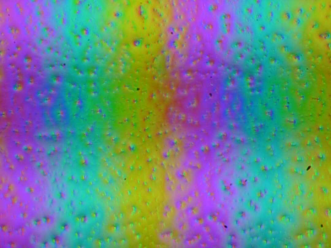 Зерно этих дефектов в несколько раз меньше размеров субпикселей (масштаб этих двух фотографий одинаковый), поэтому фокусировка на микродефектах и «перескок» фокуса по субпикселям при изменении угла зрения выражены слабо, из-за этого нет и «кристаллического» эффекта.