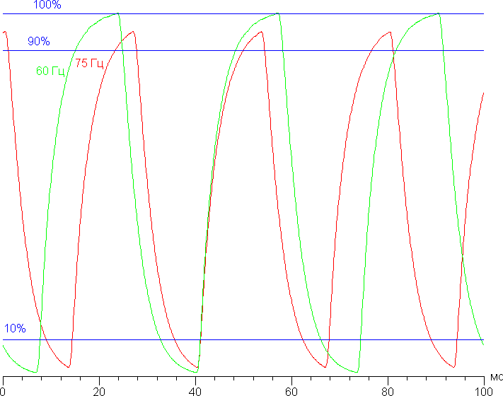 Видно, что при 75 Гц чередования кадров максимальная яркость белого кадра выше уровня 90% от белого, а минимальная яркость черного кадра ниже 10%. В итоге амплитуда изменения яркости больше 80% от уровня белого, то есть согласно этому формальному критерию скорости матрицы достаточно для полноценного вывода изображения с кадровой частотой 75 Гц.