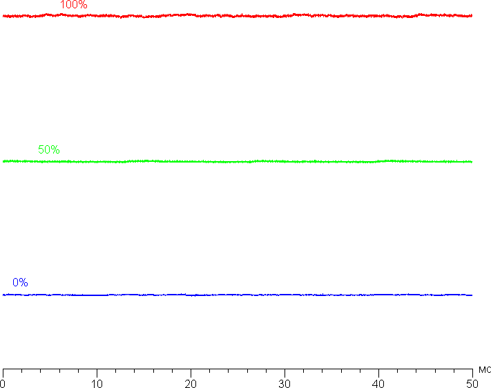 На любом уровне яркости значимая модуляция подсветки отсутствует, что исключает видимое мерцание экрана. Для тех, кто привык распознавать знакомое сокращение, уточним: ШИМ отсутствует. В доказательство приведем графики зависимости яркости (вертикальная ось) от времени (горизонтальная ось) при различных значениях настройки яркости: