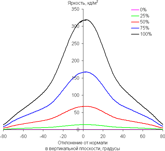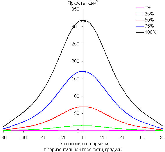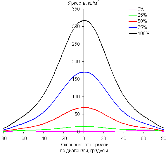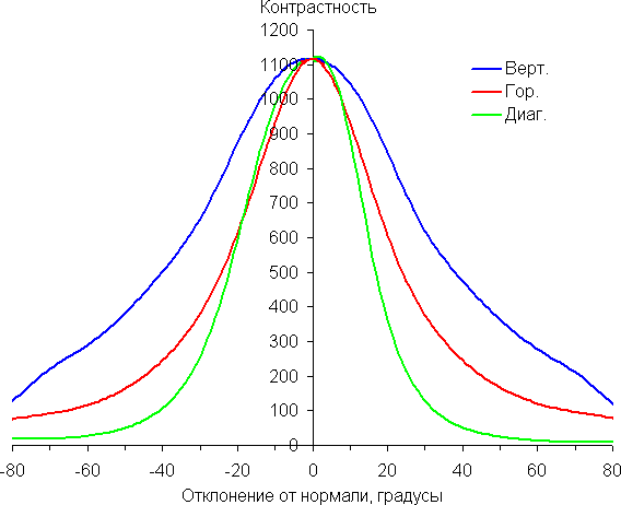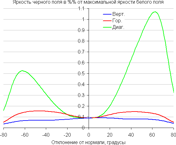 По скорости снижения яркости углы обзора не очень широкие, что для матрицы типа IPS нехарактерно. При отклонении в диагональном направлении яркость черного поля начинает резко возрастать уже при 20°-30° отклонения от перпендикуляра к экрану. Если сидеть не очень далеко от экрана, то черное поле по углам будет заметно светлее, чем в центре. Контрастность в диапазоне углов ±82° в случае отклонения по диагонали приближается к отметке 10:1, и опускается ниже при отклонении в одном направлении более чем на 67°.