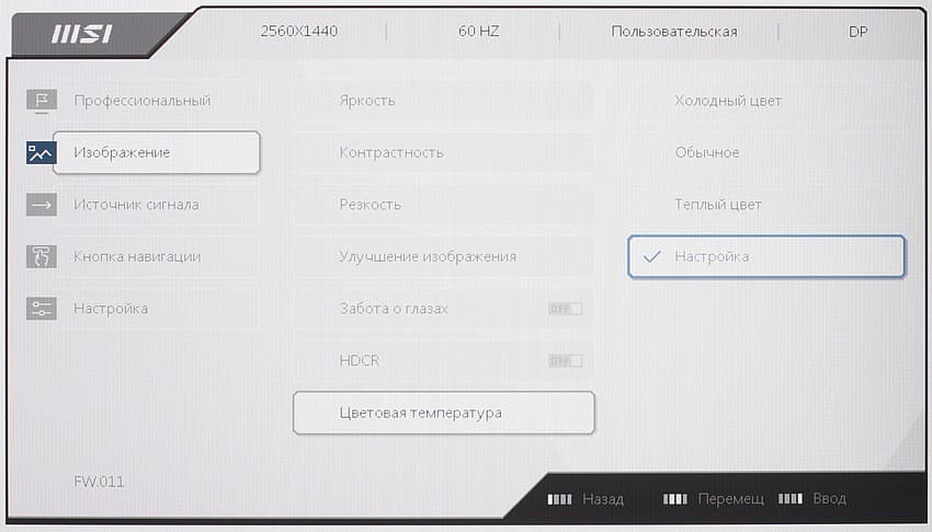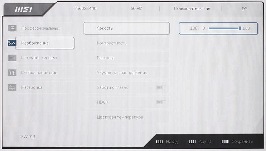 Настроек изображения совсем немного. Присутствуют стандартные настройки Контрастность и Яркость (регулирует яркость подсветки), Резкость (повышение контурной четкости), режим со сниженной интенсивности синего цвета и режим с динамической регулировкой яркости подсветки.