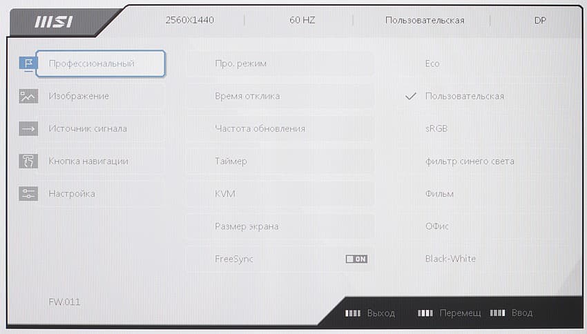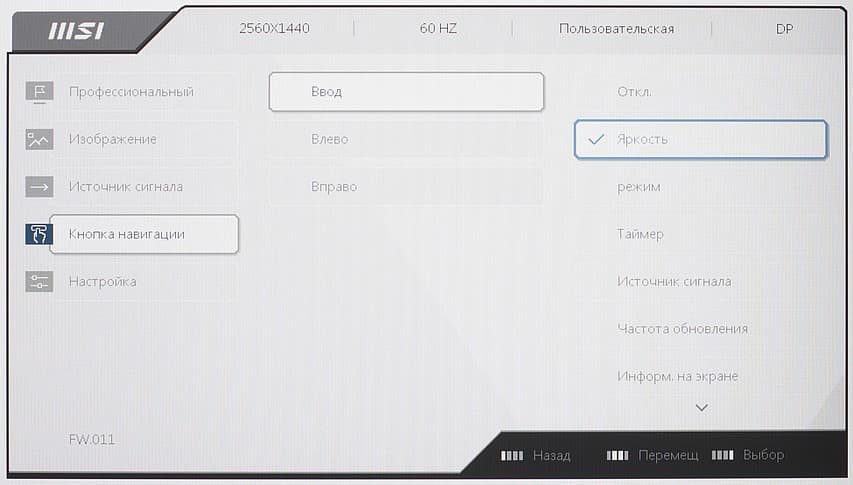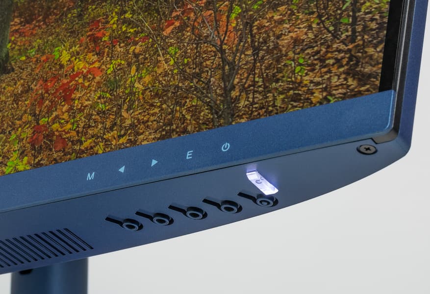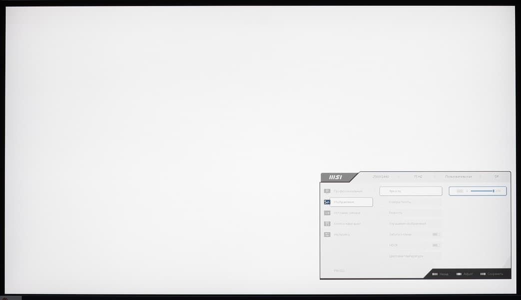 Индикатор питания при работе светится белым, в режиме ожидания — оранжевым и не горит, если монитор условно (механического выключателя питания, к сожалению, нет) выключен. Когда на экране нет меню, то при первом нажатии на первую (если слева направо) кнопку выводится меню с настройками. На вторую, третью и на четвертую кнопки — ползунок или список/короткое меню той настройки, которая назначена пользователем на данное действие.