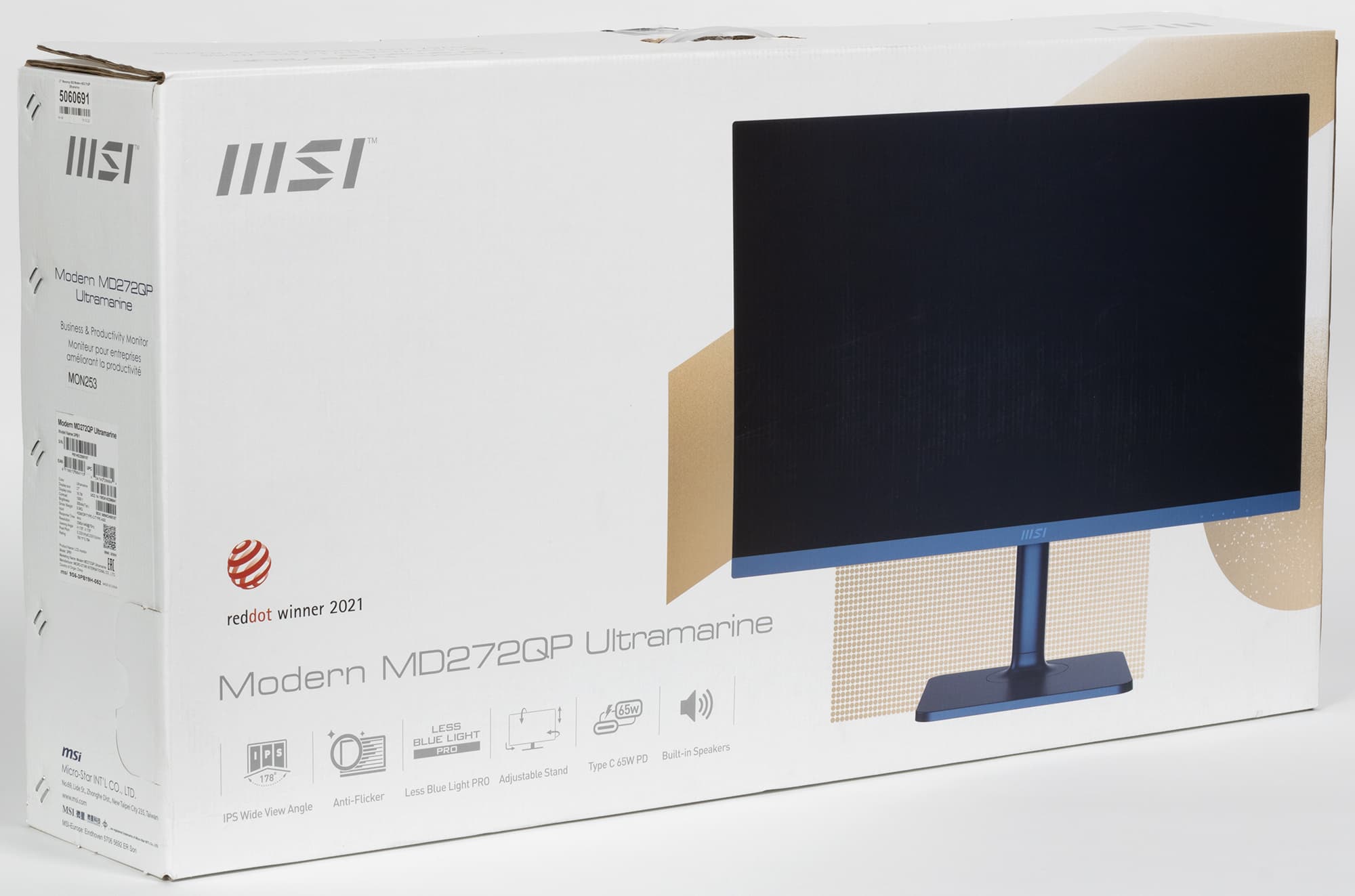 Монитор MSI Modern MD272QP Ultramarine отличается ультрамариновым цветом большинства внешних поверхностей, что уже само по себе привлекает внимание. Дизайн стильный и аккуратный, а сочетание разрешения и размера экрана позволяет без масштабирования и с комфортом работать в Windows. Данный монитор стоит считать универсальным, пригодным, например, для выполнения типичных офисных задач и для не очень ответственной работы с графикой, для работы в системах CAD/CAM, для видеомонтажа, а также для просмотра кино и для игр, если частоты обновления в 75 Гц будет достаточно. Отметим, что монитор можно использовать в качестве док-станции для ноутбука, так как выходной мощности порта USB-C в 65 Вт должно хватать в большинстве случаев.