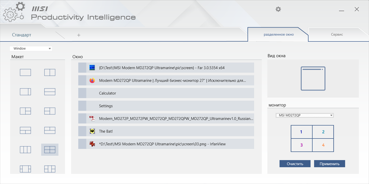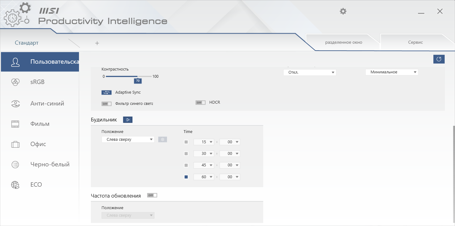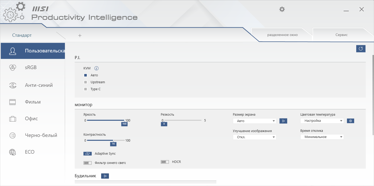 Там же можно найти программу MSI Productivity Intelligence. Она позволяет с компьютера изменять некоторые настройки монитора. Кроме того, в этой программе есть функция, упрощающая распределение окон на рабочем столе. Дополнительно можно поменять ряд системных настроек.