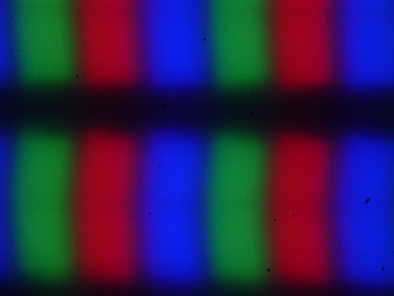 Из-за матовой поверхности экрана четкого изображения пикселей получить не удалось (черные точки — это пыль на матрице фотоаппарата), однако характерная для IPS структура субпикселей просматривается: