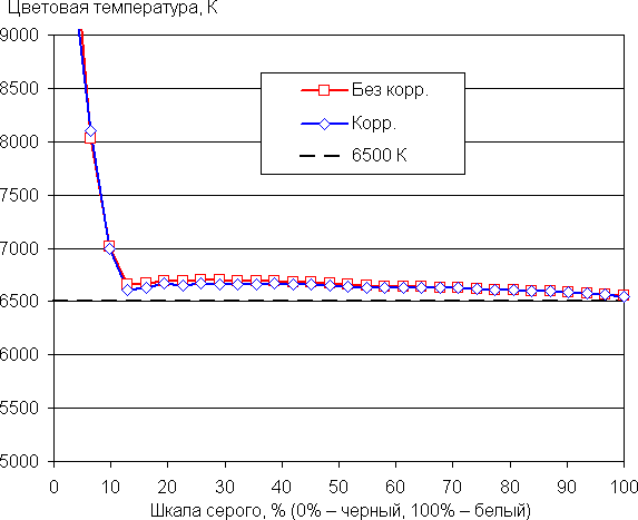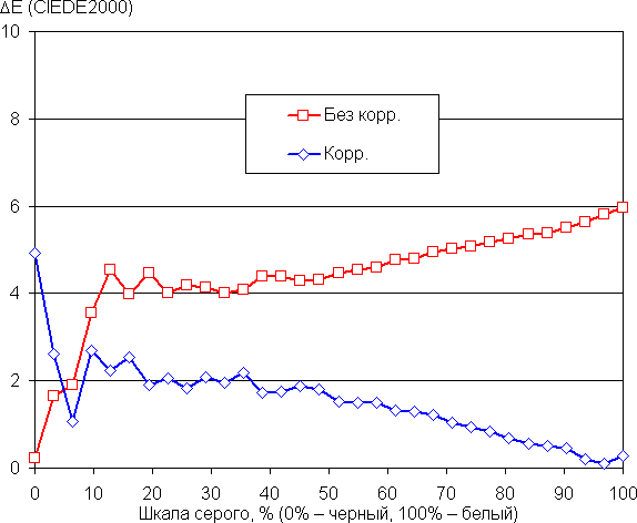 Цветовой баланс просто при выборе профиля Настройка без дополнительной коррекции (при этом достигаются максимальные значения яркости и контрастности) хороший, так как цветовая температура близка к стандартным 6500 К, и отклонение от спектра абсолютно черного тела (параметр ΔE) меньше 10 единиц, что для потребительского устройства считается хорошим показателем. При этом оба параметра мало изменяются на различных участках шкалы серого, что улучшает визуальное восприятие цветового баланса. Однако мы попытались вручную скорректировать цвета, регулируя усиление трех основных цветов. Графики ниже показывают цветовую температуру на различных участках шкалы серого и ΔE в случае исходного профиля Настройка (Без корр.) и после ручной коррекции (50, 48 и 50 для интенсивностей красного, зеленого и синего цветов — Корр.):