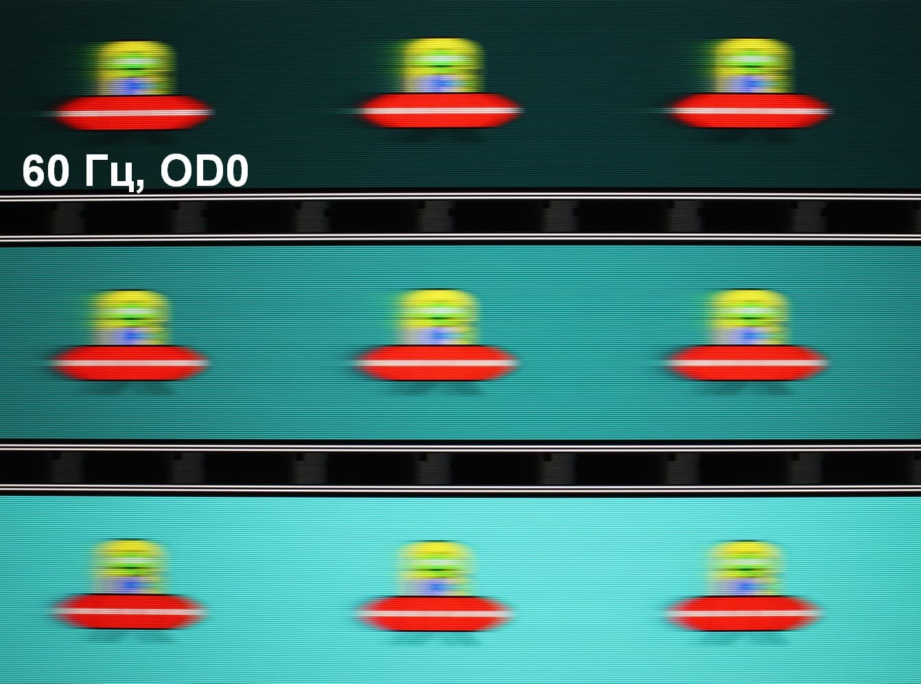 Видно, что при прочих равных условиях четкость изображения повышается по мере роста частоты обновления и степени разгона, но на максимальном разгоне артефакты (шлейф позади тарелки) уже очень заметные.