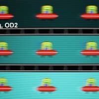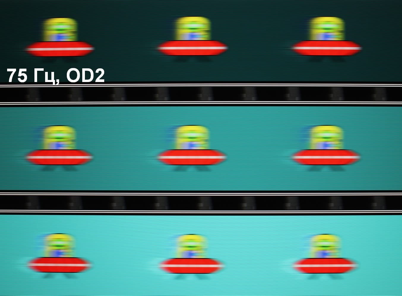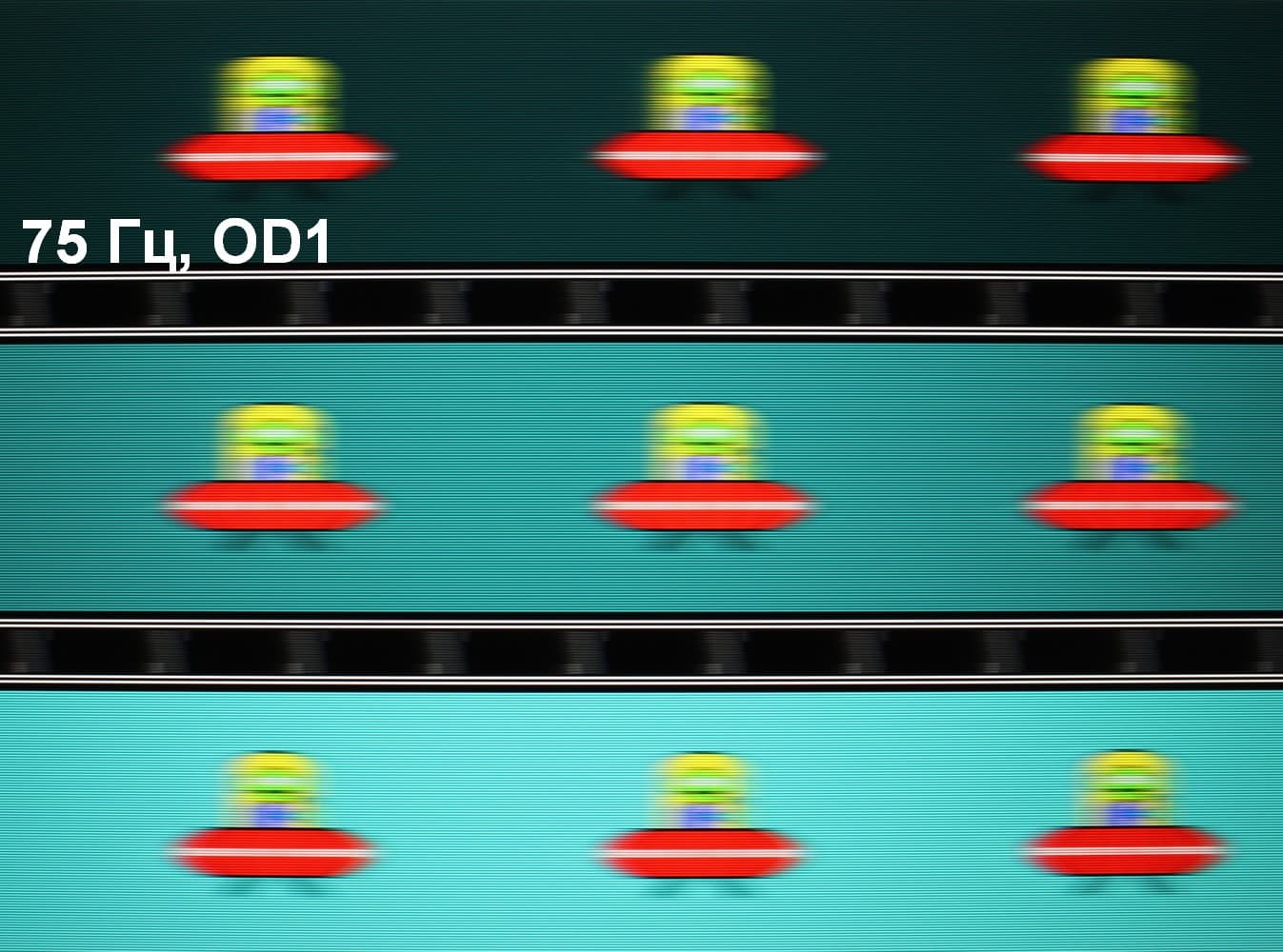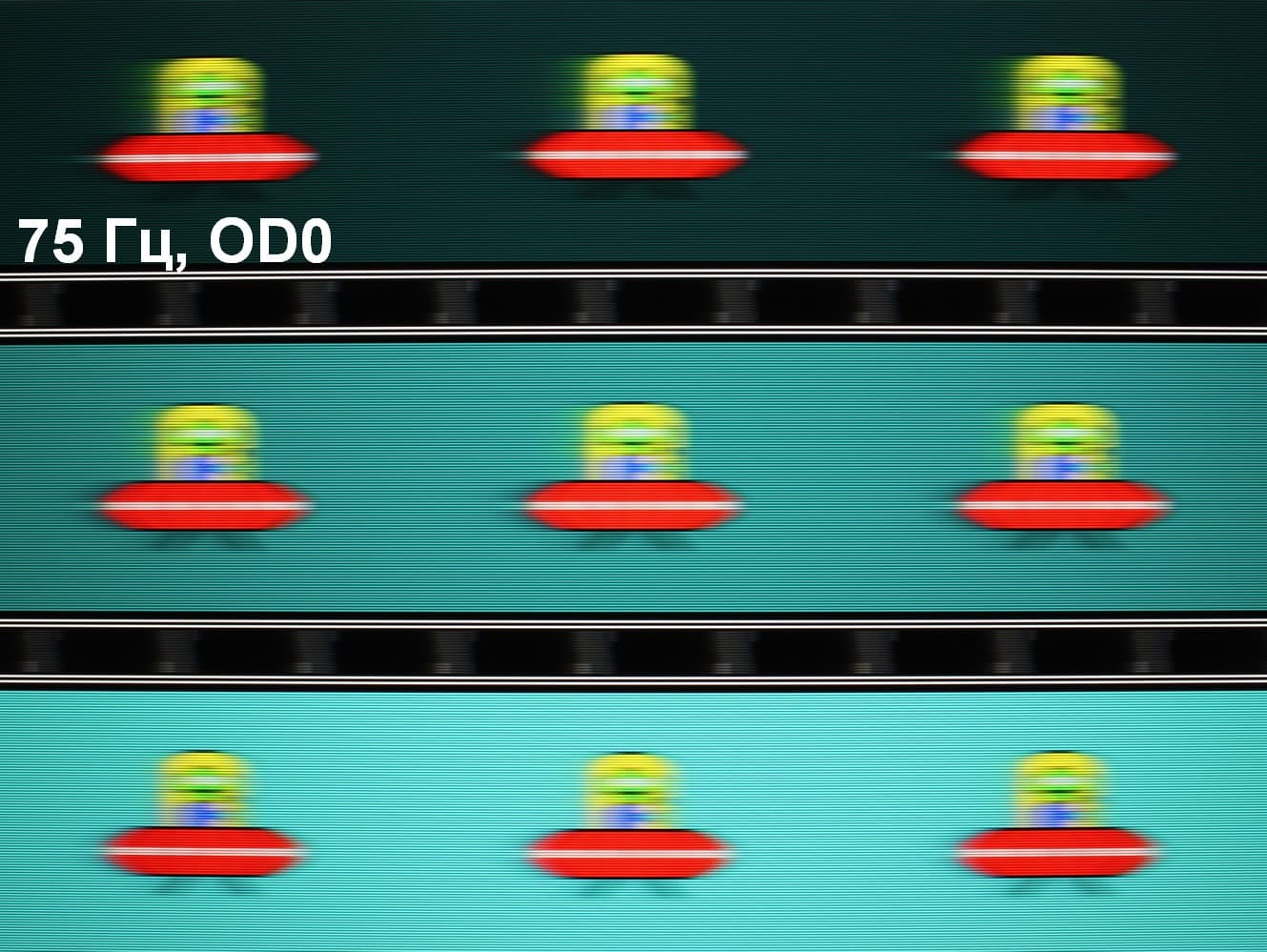 Для наглядного представления о том, что на практике означает такая скорость матрицы и какие могут быть артефакты от разгона, приведем серию снимков, полученных с помощью движущейся камеры. Такие снимки показывают, что видит человек, если он следит глазами за двигающимся на экране объектом. Описание теста приведено тут, страница с самим тестом тут. Использовались рекомендованные установки — скорость движения 960 пиксель/с для частоты 60 Гц, и 975 пиксель/с для 75 Гц. Выдержка 1/15 с, на фотографиях указаны значения частоты обновления, а также ступень разгона (OD с цифрой).