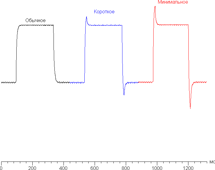 Ниже приведены графики полутонового перехода между оттенками 70% и 90% и обратно при различных значениях настройки Время отклика (по вертикали — яркость, по горизонтали — время, для наглядности графики выстроены последовательно):