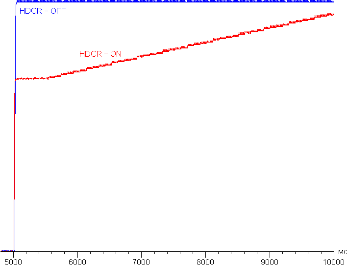При включении режима HDCR установившаяся контрастность формально возрастает до бесконечности, так как на черном поле во весь экран яркость подсветки медленно снижается, и через 20 секунд она выключается совсем. В принципе, динамическая подстройка яркости может улучшить восприятие темных сцен, но в данном случае скорость изменения яркости подсветки невысокая, поэтому практической пользы от этой функции немного. График ниже показывает, как увеличивается яркость (вертикальная ось) при переключении с черного поля во весь экран (после 5 секунд выдержки) на белое поле во весь экран при выключенной и включенной динамической подстройки яркости: