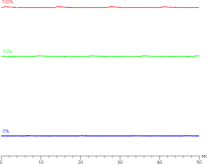 На любом уровне яркости значимая модуляция подсветки отсутствует, что исключает видимое мерцание экрана. Для тех, кто привык распознавать знакомое сокращение, уточним: ШИМ отсутствует. В доказательство приведем графики зависимости яркости (вертикальная ось) от времени (горизонтальная ось) при различных значениях настройки яркости: