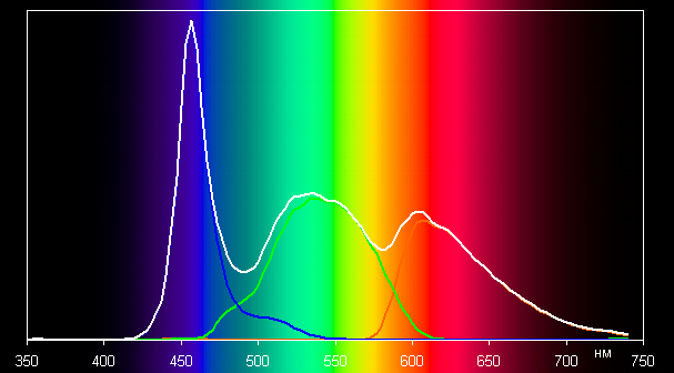 Такой спектр с относительно узким пиком синего и с широкими горбами зеленого и красного цветов характерен для мониторов, в которых используется белая светодиодная подсветка с синим излучателем и желтым люминофором.