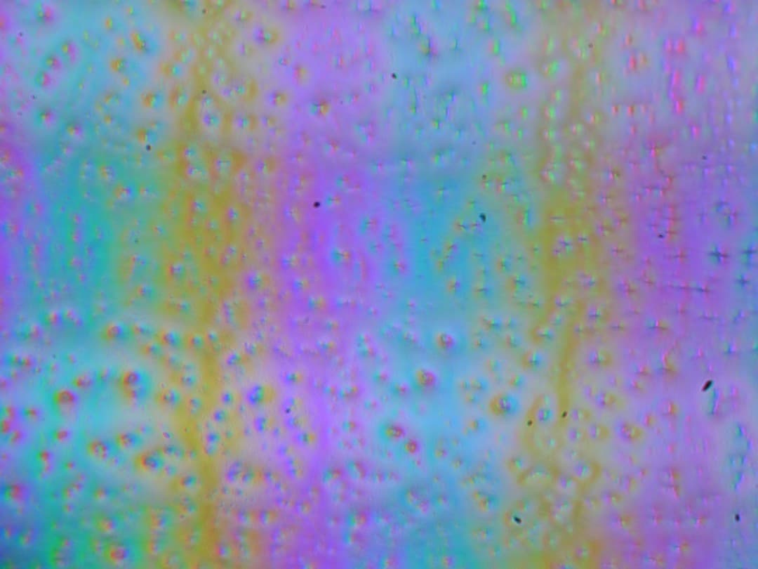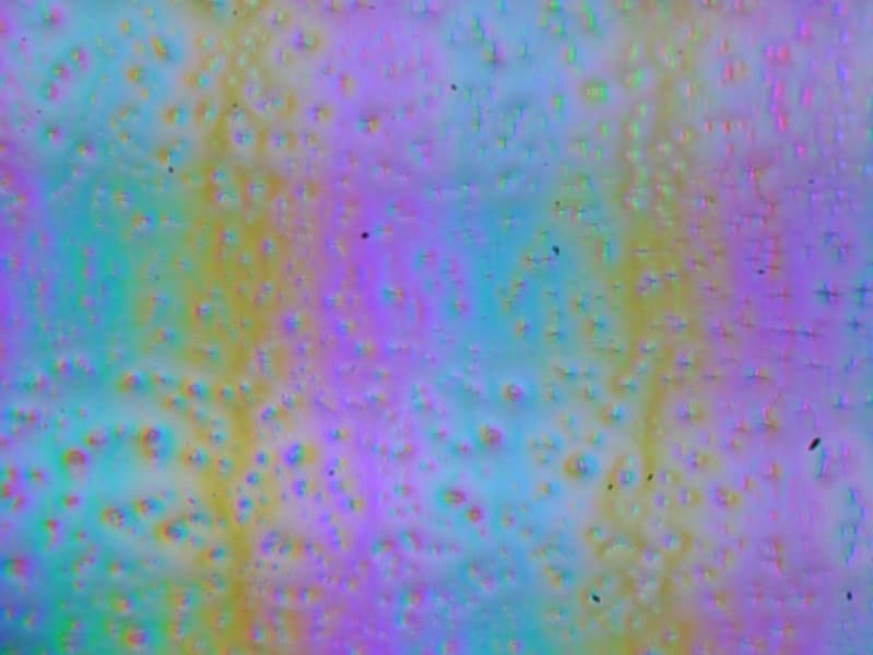 Зерно этих дефектов в несколько раз меньше размеров субпикселей (масштаб этих двух фотографий одинаковый), поэтому фокусировка на микродефектах и «перескок» фокуса по субпикселям при изменении угла зрения выражены слабо, из-за этого нет и «кристаллического» эффекта.