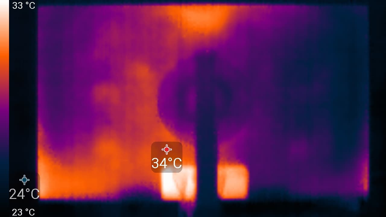 Нагрев монитора можно оценить по приведенным снимкам с ИК-камеры, полученным после долговременной работы монитора на максимальной яркости в помещении с температурой примерно 24 °C: