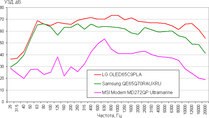 Качество встроенных громкоговорителей невысокое. Для сидящего перед монитором пользователя их громкость едва достаточная, низких частот нет совсем, есть выраженный «пластиковый» призвук из-за резонансов корпуса, стереофонический эффект расслышать можно. Сравним АЧХ этого монитора с АЧХ двух телевизоров высшего класса (воспроизводился розовый шум, уровни звукового давления в 1/3 октавах записывал шумомер Октава-111):