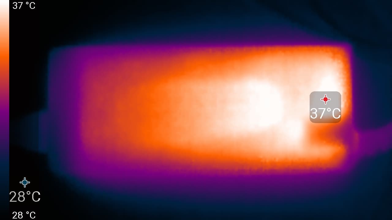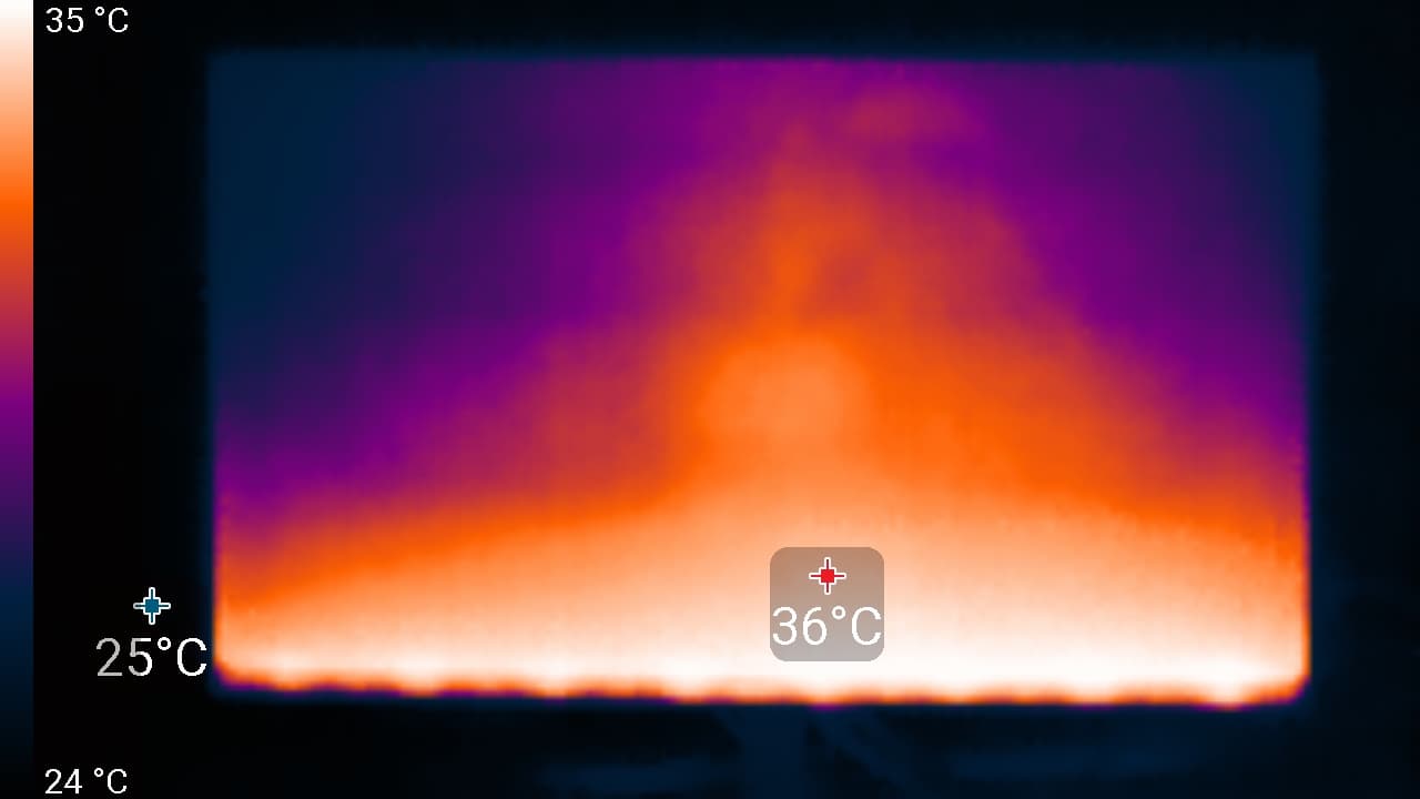 Нижний край экрана нагрелся до 36 °C максимум. Видимо, внизу находится светодиодная линейка подсветки экрана. Нагрев сзади умеренный. Корпус БП нагрелся всего до 37 °C, но это все же без возможной дополнительной нагрузки в 65 Вт и даже чуть более: