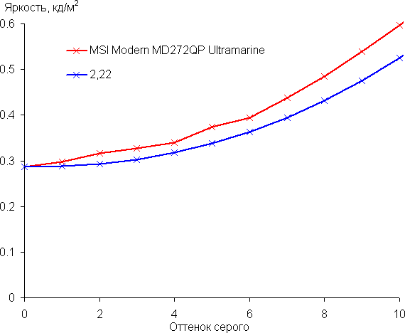 Рост прироста яркости достаточно равномерный, и каждый следующий оттенок значимо ярче предыдущего, даже в самой темной области: