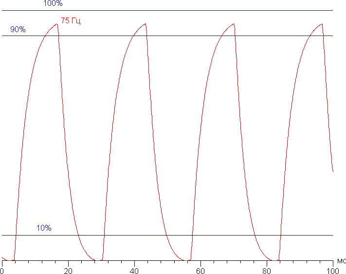 Приведем зависимость яркости (вертикальная ось) от времени (горизонтальная ось) при чередовании белого и черного кадра при кадровой частоте 75 Гц: