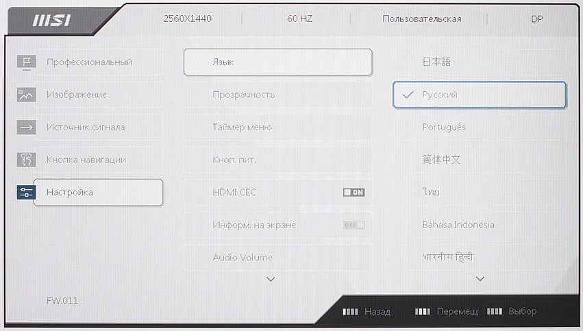 Навигация в принципе удобная, но неудобство могут вызвать сами кнопки, списки зациклены. В нижней части меню есть подсказка по функциям кнопок. При настройке изображения меню остается на экране, что немного мешает оценке вносимых изменений. При необходимости можно настроить уровень прозрачности фона и выбрать задержку автоматического выхода из меню. Есть русская версия экранного меню. Кириллический шрифт ровный, качество перевода на русский язык приемлемое.
